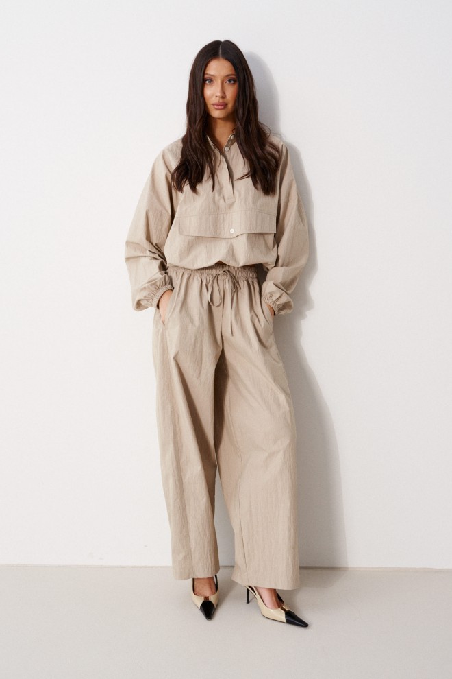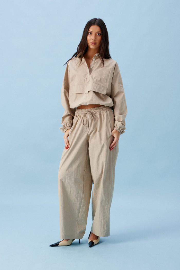 Блузон прямого свободного кроя выполнен из хлопковой ткани, в оттенке светлой оливы. Характеристики: отложной воротник, застежка центральная на петли пуговицы, по переду имитация кармана. Низ изделия на резинке с фиксатором, на спинке расположена надпись "Made in Belarus. Annete". Плечо спущено, рукав свободный, низ рукава на резинке. Длина по спинке 58 см, длина рукава от края горловины 83 см.
