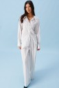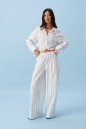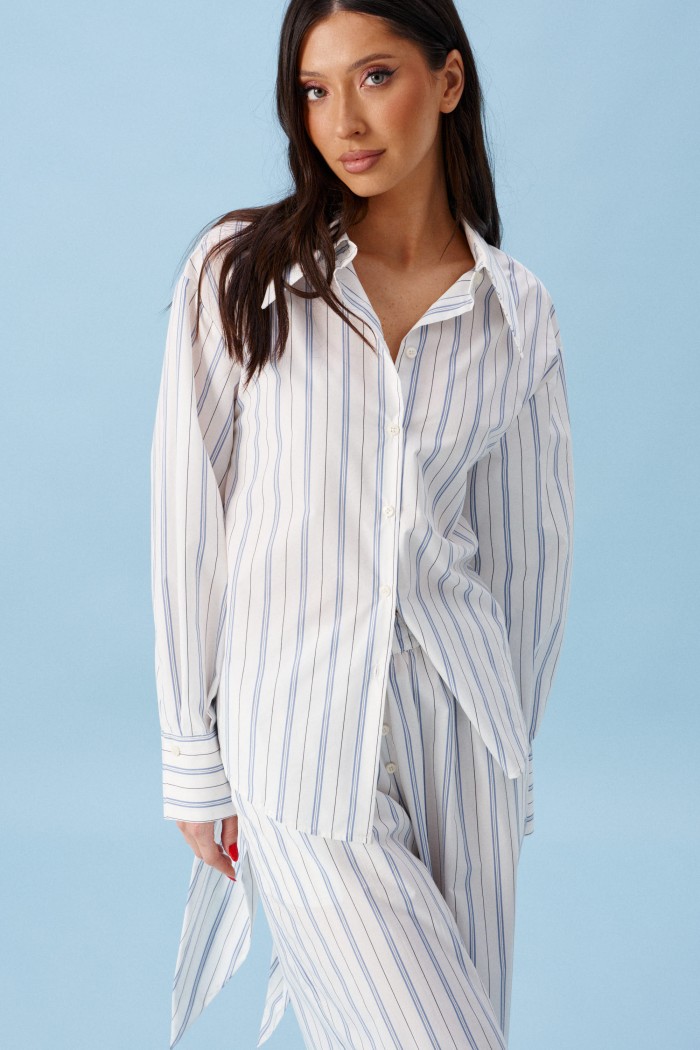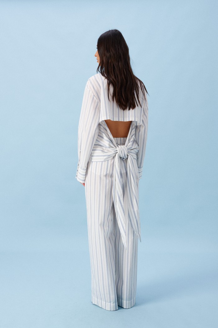 Блузка приталенного силуэта, выполнена из хлопковой белой ткани в черную и синюю полоску. Характеристики : Воротник отложной на стойке, рукав одношовный, втачной, по низу рукава притачная манжета. Застежка центральная на петли пуговицы. Верхняя часть спинки закрытая, длина 31см. Низ идет на завязках. Длина переда 67см, длина рукава от края горловины 77см.