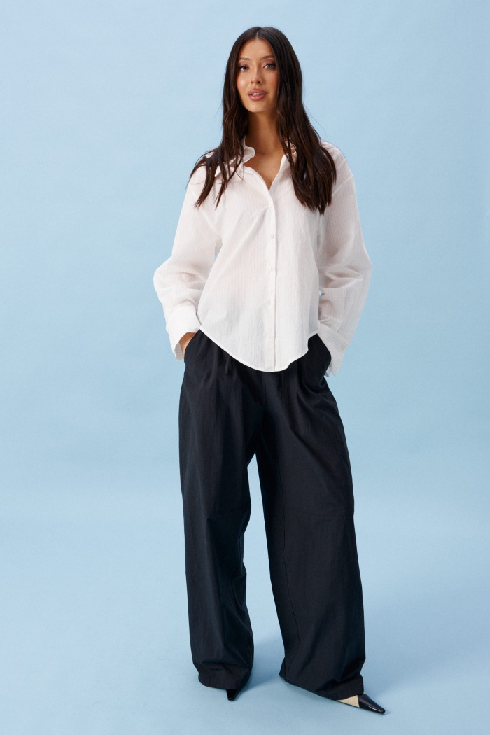Блузка приталенного силуэта, выполнена из хлопковой белой ткани в мелкую бежевую полоску. Характеристики : Воротник отложной на стойке, рукав одношовный, втачной, по низу рукава притачная манжета. Застежка центральная на петли пуговицы. Верхняя часть спинки закрытая, длина 31см. Низ идет на завязках. Длина переда 67см, длина рукава от края горловины 77см.