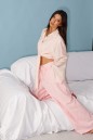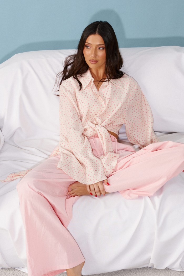 Блузка прямого кроя, выполнена из ткани нежно персикового цвета в мелкий цветок. Характеристика: прямой крой, по переду рубашки цельнокроенные завязки, воротник отложной, застежка центральная на петли пуговицы, рукав втачной, расширяется к низу. Длина изделия по центру спинки 43 см, длина рукава от края горловины 81 см.