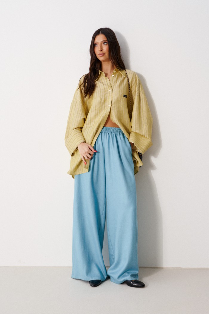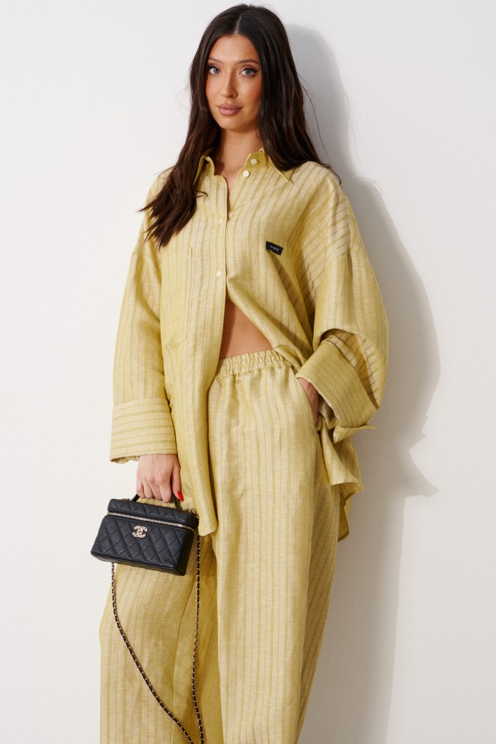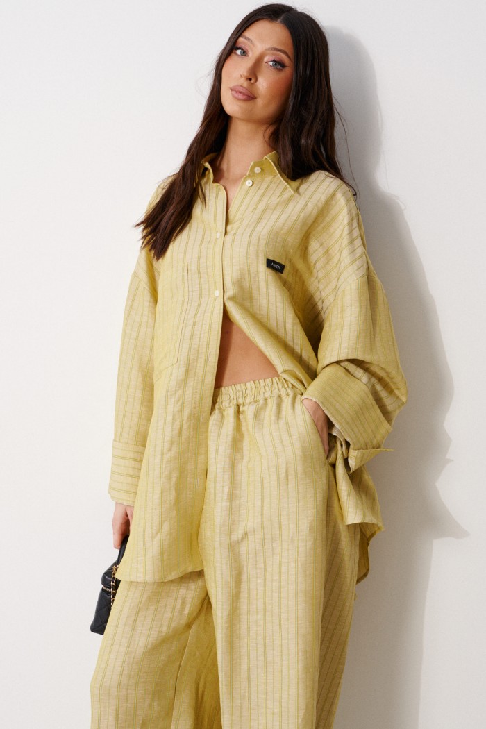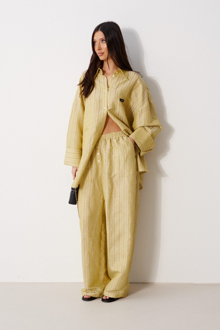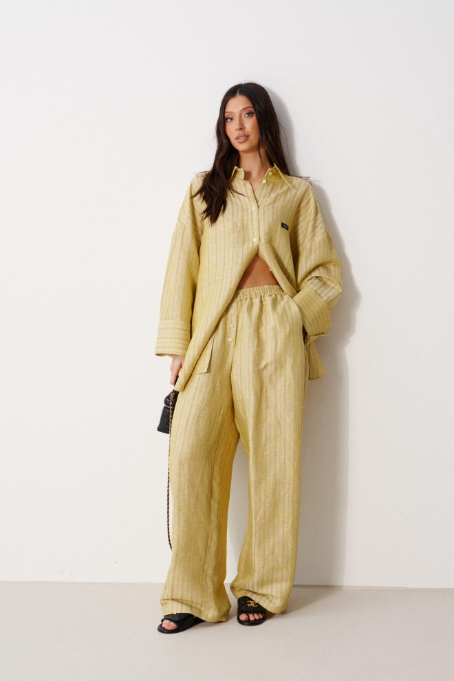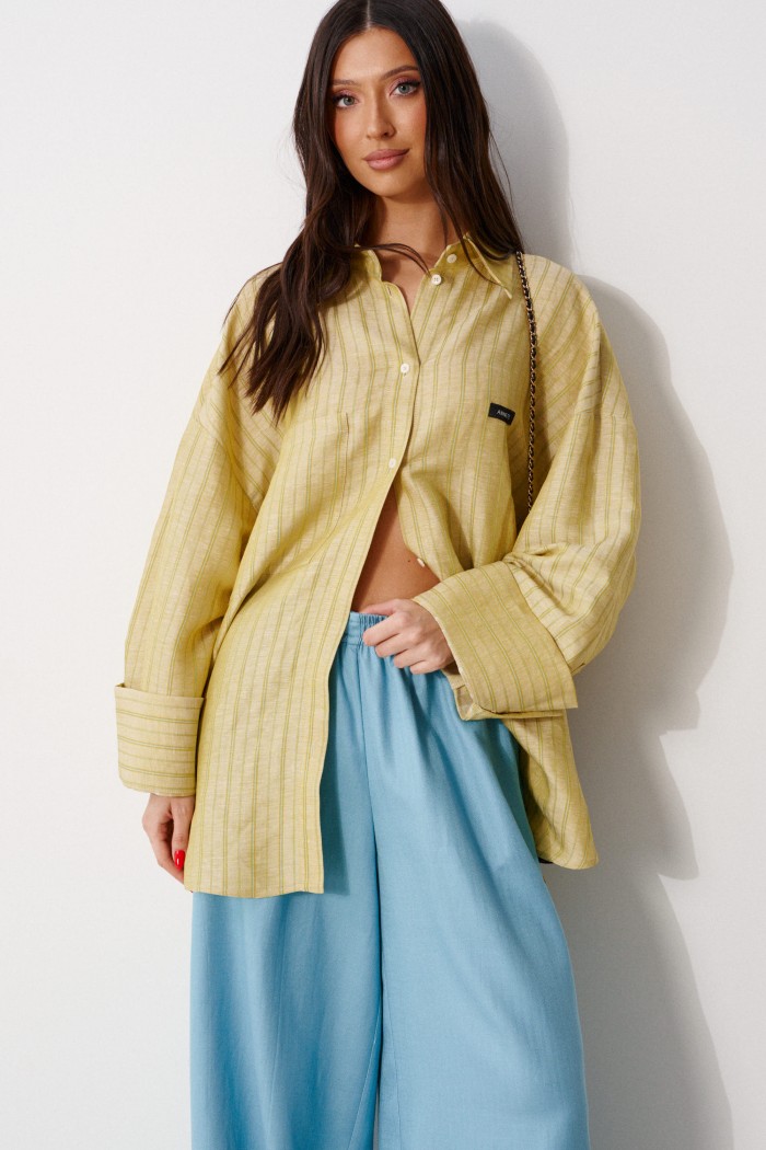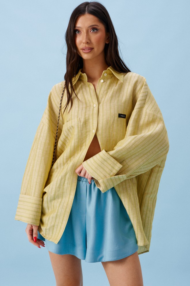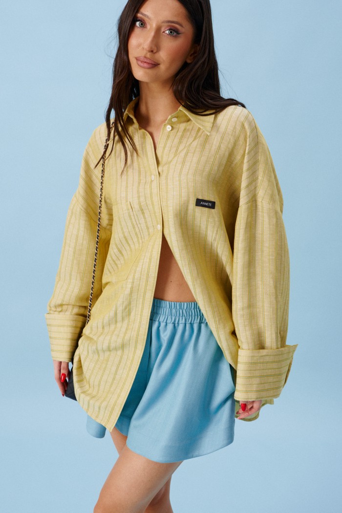 Рубашка прямого свободного кроя, выполнена из полотна оливкового цвета в узкую полоску. Характеристика: воротник отложной, застёжка центральная на пуговицы, по переду справа на уровне линии груди накладной карман, слева - брендированная нашивка Annete, рукав спущенный свободный, с широкой манжетой на пуговицах, спинка отрезная со складками. Длина рукава от края горловины 82 см. Длин по центру спинки от края горловины 82 см.