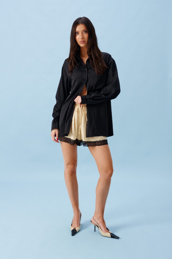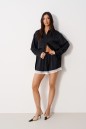 Рубашка свободного кроя выполнена из тексильного мягкого полотна черного цвета. Характеристики: прямой крой, отложной воротник, застежка центральная на пуговицы, рукав втачной, немного спущен, широкая манжета на двух пуговицах, в боковых швах разрезы 27см, на груди функциональные накладные карманы. Длина рукава от края горловины 78 см, длина по центру спинки 71 см.