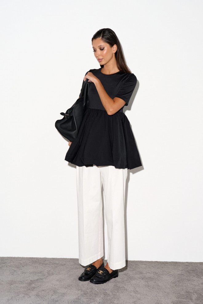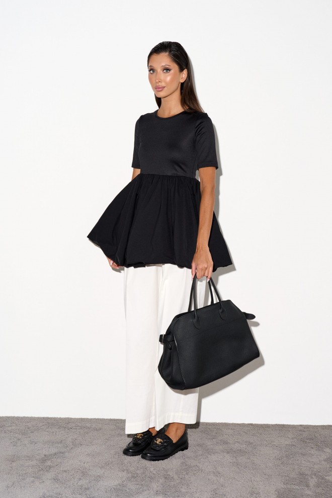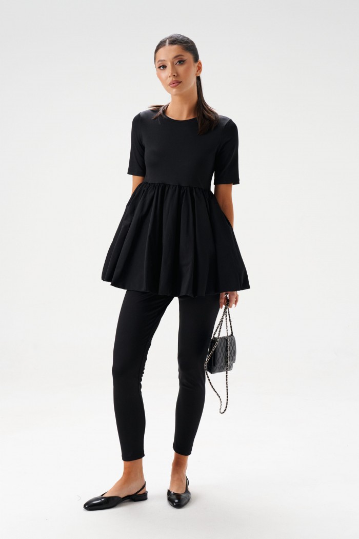 Характеристики: полуприлегающий силуэт, горловина овальная, верх изделия выполнен из эластичного полотна, низ изделия выполнен декоративной сборкой с подгибом, рукав втачной. Длина от края плеча 71 см , длина рукава 26 см.