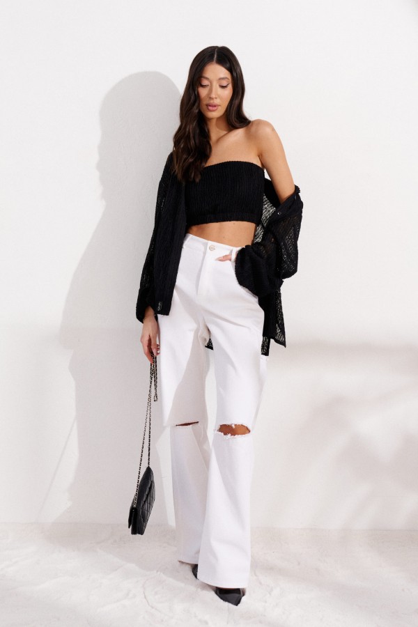 Топ выполнен из полупрозрачного полотна ажурной вязки.