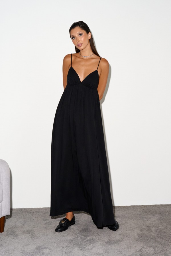 Туника прямого свободного кроя выполнена из струящегося полотна черного цвета.