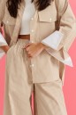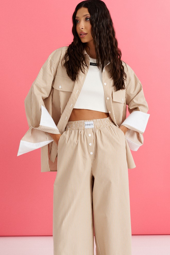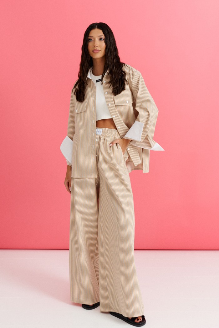 Рубашка прямого кроя выполнена из ткани цвета капучино с принтом белая вертикальная полоска.
