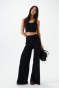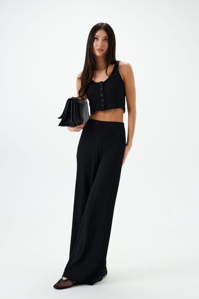 Укороченный топ выполнен из трикотажного полотна узорной вязки черного цвета. Характеристики: укороченный топ, бретели, застежка центральная на петли пуговицы. Длина 40 см. Образ дополнят брюки - артикул А1300