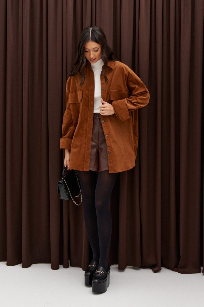 Рубашка прямого свободного кроя выполнена из замшевого полотна. Характеристики: прямой крой, отложной воротник, застежка центральная на планке на петли пуговицы, по переду карманы с клапанами, рукав свободного кроя спущен, по низу рукава манжета на пуговичке, спинка отрезная с декоративной сборкой. Длина по спинке 76 см, длина рукава 80 см от края горловины