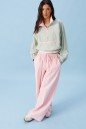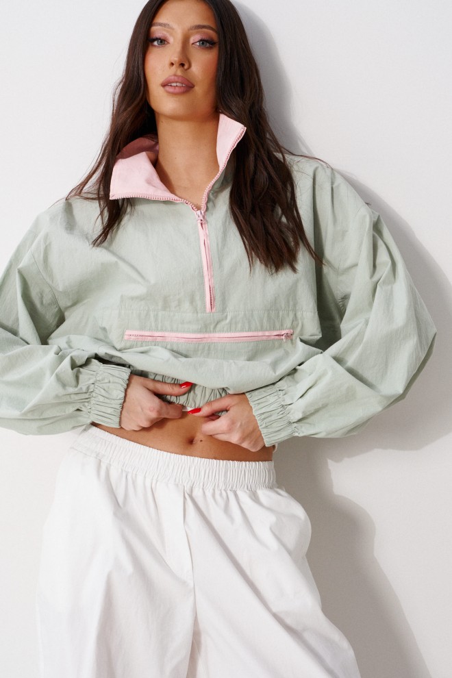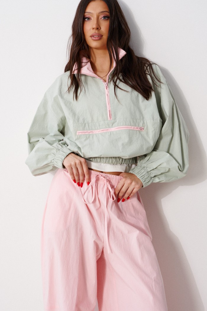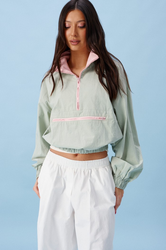 Блузон прямого свободного кроя выполнен из хлопковой ткани, в оттенке светлой оливы. Характеристики: отложной воротник, внетренняя часть выполнена из ткани розового цвета застежка молния, по переду карман на молнии. Низ изделия на резинке с фиксатором. Плечо спущено, рукав свободный, низ рукава на резинке. Длина по спинке 58 см, длина рукава от края горловины 83 см.