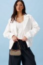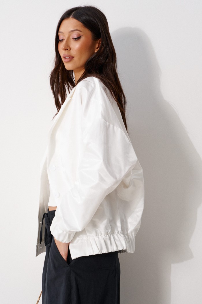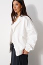 Жакет-бомбер свободного кроя, выполнен из текстильного полотна белого цвета с напылением блеска. Характеристика: свободный крой, на подкладке, отложной воротник с острыми лацканами, застежка центральная на петли пуговицы, по деталям полочек прорезные карманы с накладными листочками, рукав спущенный, по низу рукава манжета на резинке. Низ изделия присборен на широкую резинку. Длина рукава от края горловины 77 см, длина изделия по спинке 65 см.
