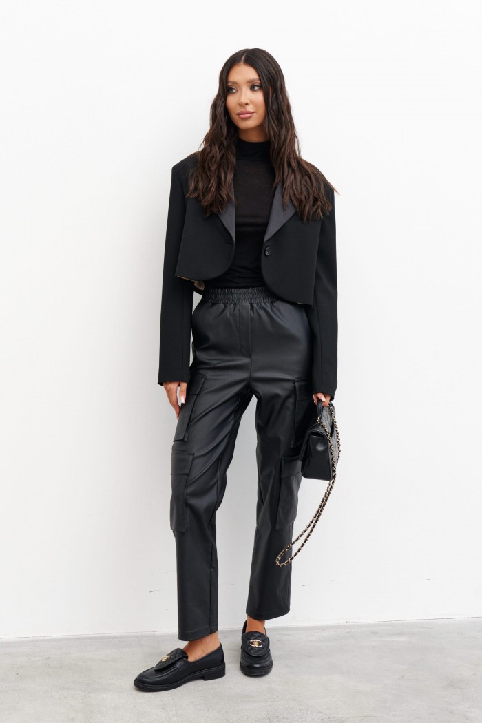 Брюки прямого кроя с акцентными карманами выполнены из искусственной кожи.