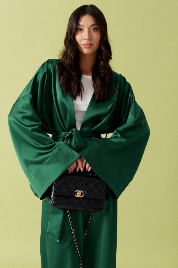 Брюки прямого кроя выполнены из ткани изумрудного цвета.