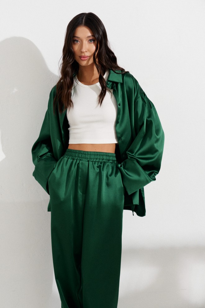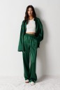 Брюки прямого кроя выполнены из ткани изумрудного цвета.
