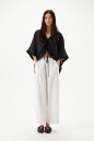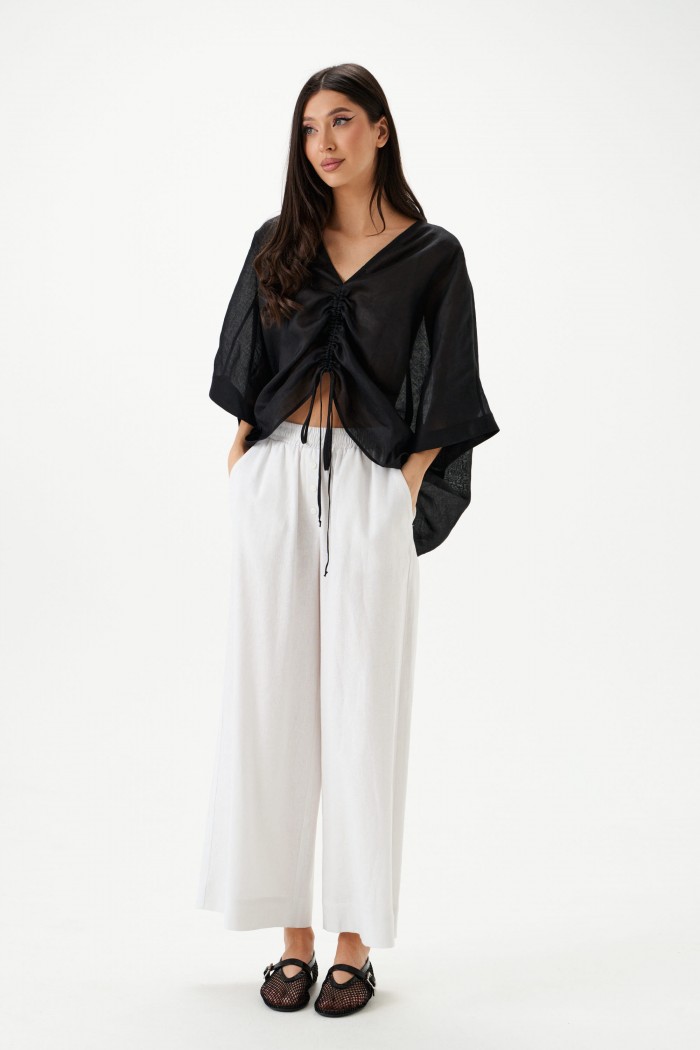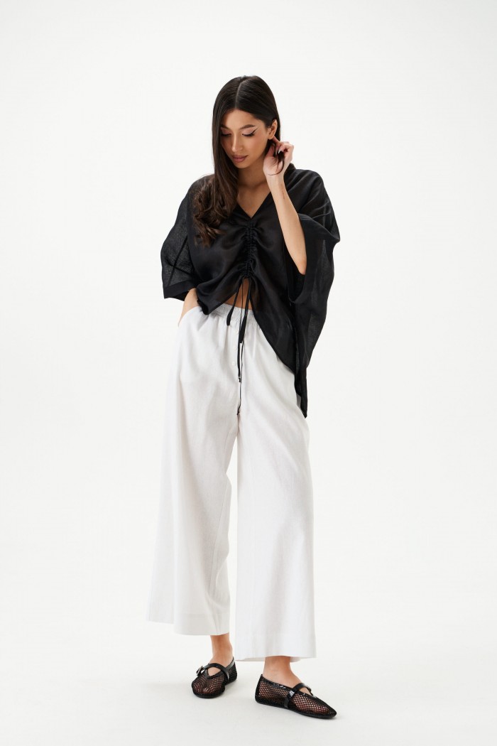 Брюки прямого кроя выполнены из ткани белого цвета.