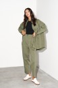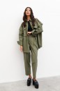 Брюки прямого кроя с декоративными складками выполнены из ткани цвета хаки. Характеристики: прямой крой, пояс стабильный, по поясу нашиты шлевки, застежка пуговица, молния, по переду декоративные складки, по передней и задней части изделия заутюженные стрелки, в боковых швах карманы. Длина брюк 97 см.