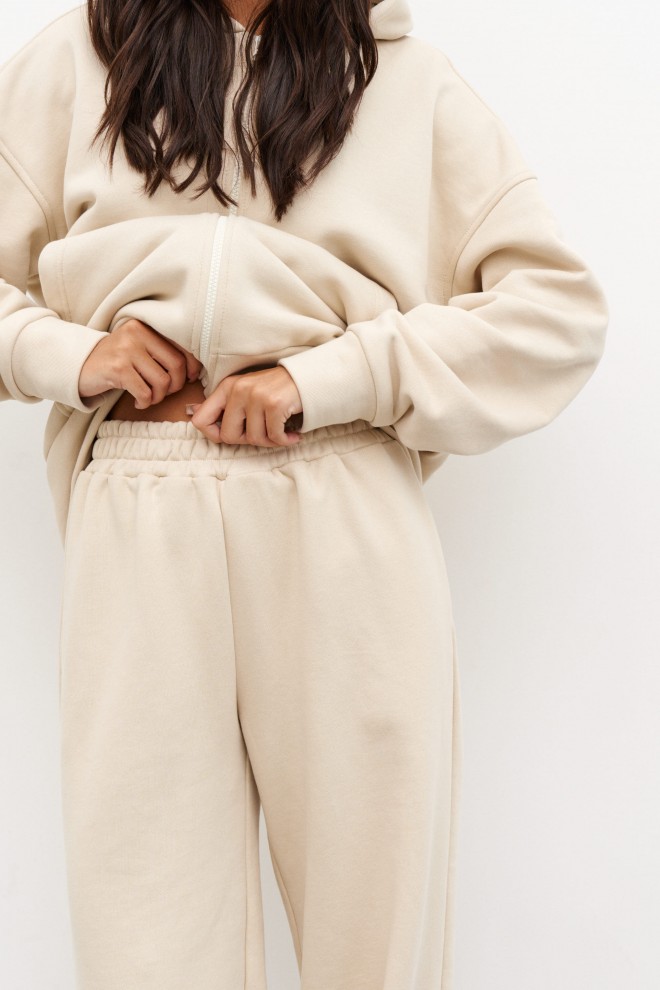 Брюки выполнены из трикотажного полотна песочного цвета. Брюки свободного кроя, пояс брюк на резинке, в боковых швах карманы. Низ изделия не обработан с закрепками по боковым швам. Длина по боковому шву 108 см.