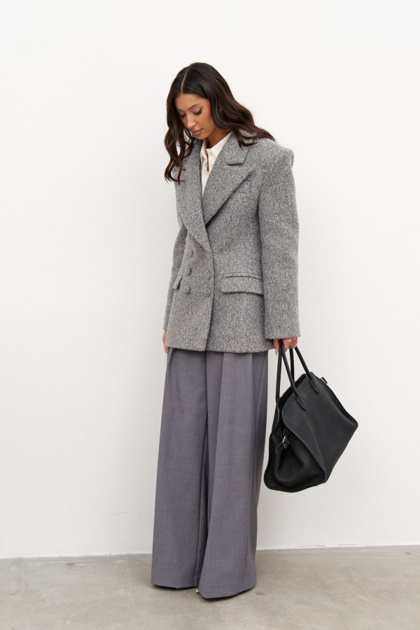 Брюки прямого свободного кроя выполнены из полотна серого цвета. Характеристики: прямой крой, пояс стабильный, по поясу нашиты широкие шлевки, декоративная сборка по передней части, заутюженные стрелки по переднему и заднему полотну брюк. Длина изделия 112 см