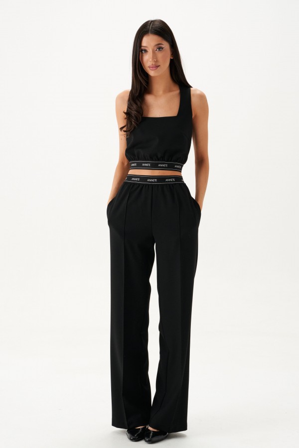 Брюки прямого кроя. Выполнены из костюмной ткани чёрного цвета. Пояс на брендированной резинке. Застёжки нет. По передней и задней частям застроченные стрелки. В боковых швах карманы. Длина 108 см