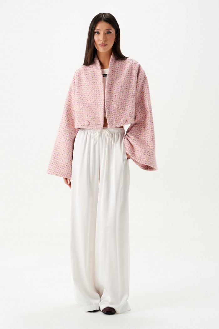 Характеристики: прямой свободный крой, пояс на кулиске, в боковых швах карманы. Длина брюк по боковому шву 111 см.