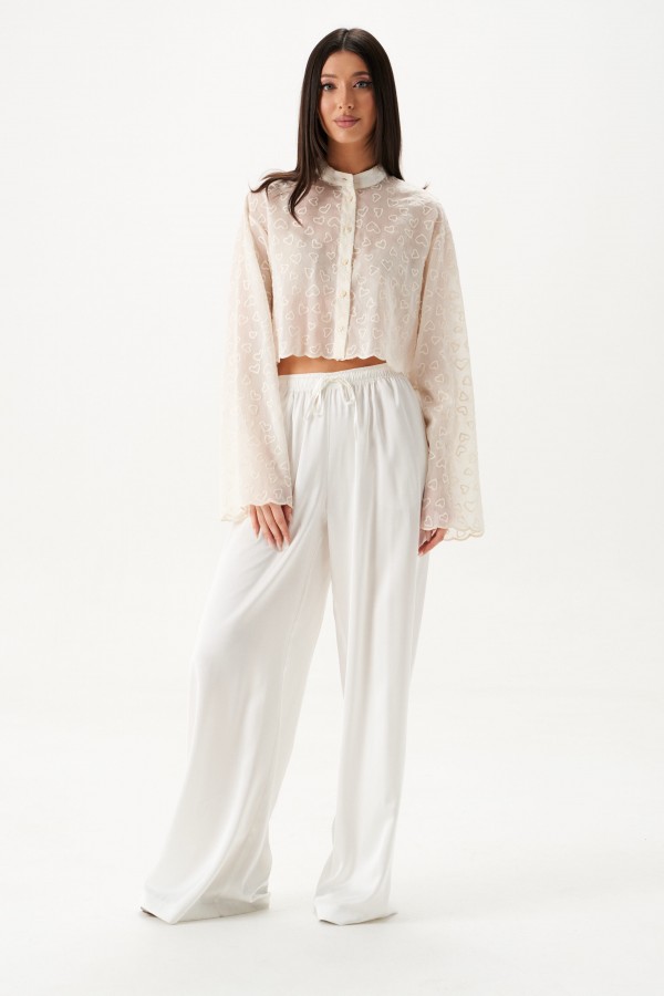 Брюки выполнены из струящейся ткани, молочного цвета.