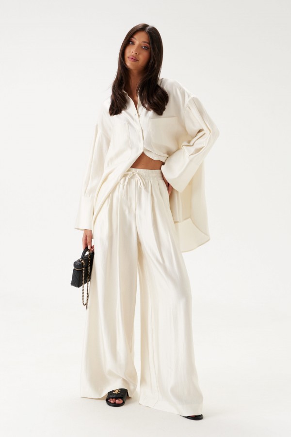 Брюки прямого свободного кроя. Выполнены из текстильной ткани молочного цвета с мягким блеском. Пояс на резинке, с кулиской. По переду имитация застёжки. Наклонные карманы. Длина 110 см (с учётом пояса)