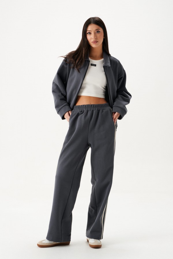 Брюки выполнены из трикотажного полотна серого цвета. Брюки свободного кроя, пояс брюк на резинке, в боковых швах карманы. По боковым швам изделия встрочен декоротивный элемент в виде лампасов. Длина по боковому шву 102 см.