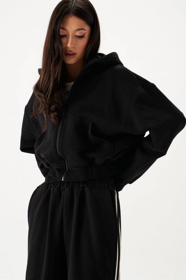 Брюки выполнены из трикотажного полотна черного цвета. Брюки свободного кроя, пояс брюк на резинке, в боковых швах карманы. По боковым швам изделия встрочен декоротивный элемент в виде лампасов. Длина по боковому шву 96 см.