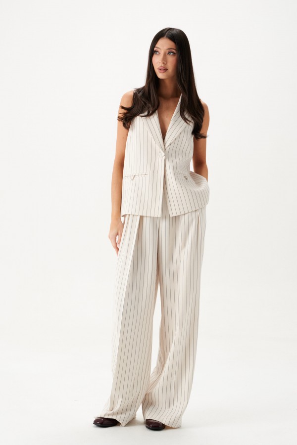 Брюки прямого свободного кроя. Выполнены из костюмной ткани молочной цвета с тонкой полоской чёрного цвета. Пояс стабильный, застёжка - молния, пуговица. На поясе шлёвки. Наклонные карманы. От пояса по передней части складки. По передней и задней части изделия - заутюженные стрелки. Длина 113 см (с учётом пояса)