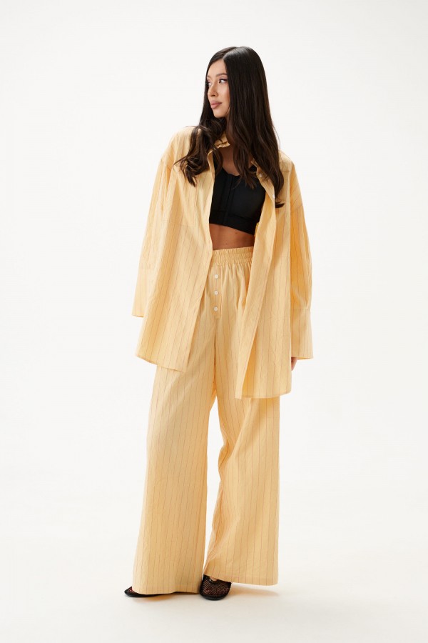 Брюки прямого кроя выполнены из текстильного полотна нежно-желтого цвета с принтом вертикальная полоска.