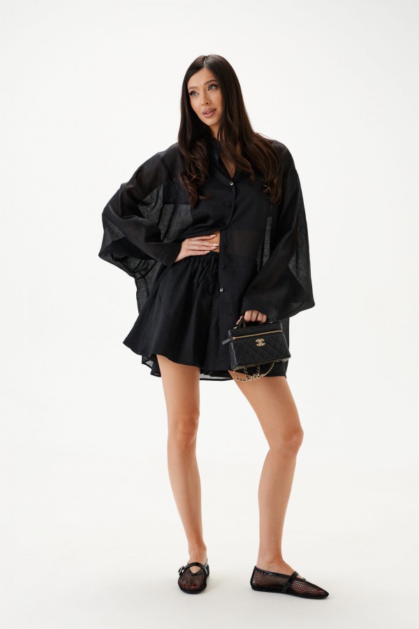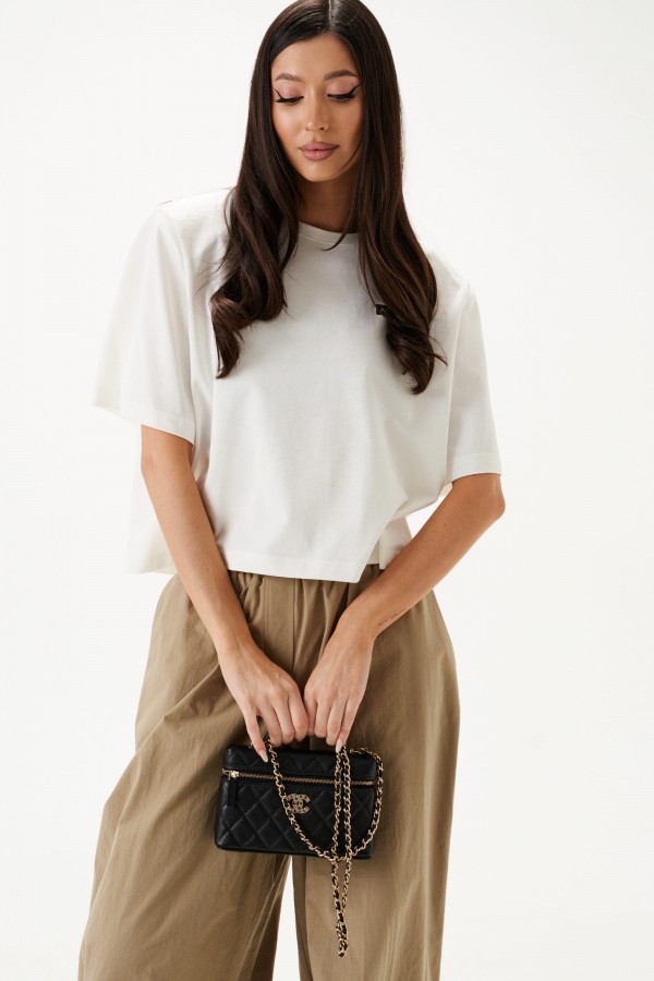 Брюки прямого свободного кроя. Выполнены из полотна небесно-перламутрового цвета с блеском . Пояс на резинке, в боковых швах карманы, иммитация застежки с пуговичками по переду. Длина по боковому шву 103 см.