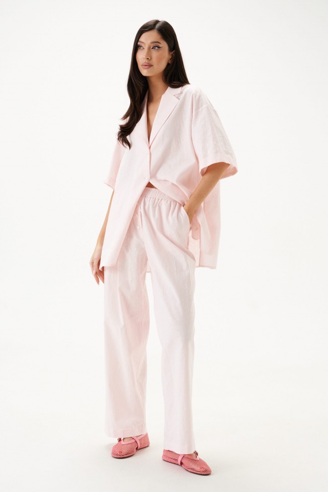 Брюки из натурального полотна, широкие, длинные.В боковых швах обработаны карманы с отрезным бочком.