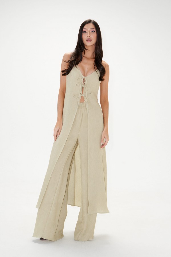 Брюки прямого кроя. Выполнены из текстильного полотна "гофре". Без бокового шва. Пояс на резинке. Низ обработан открытым срезом. Длина 108 см