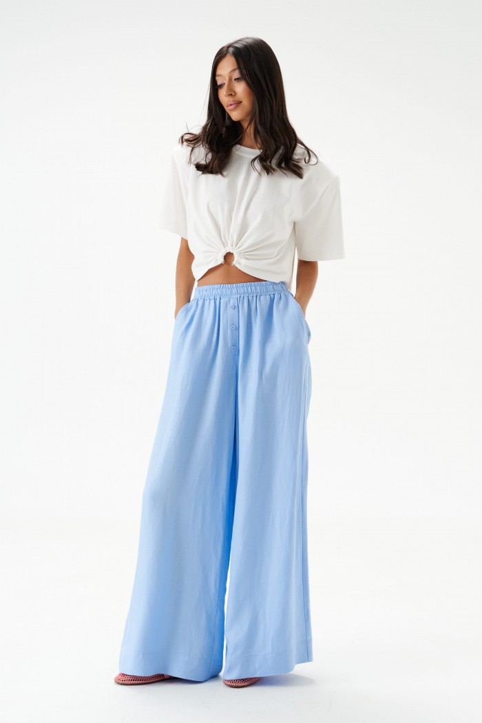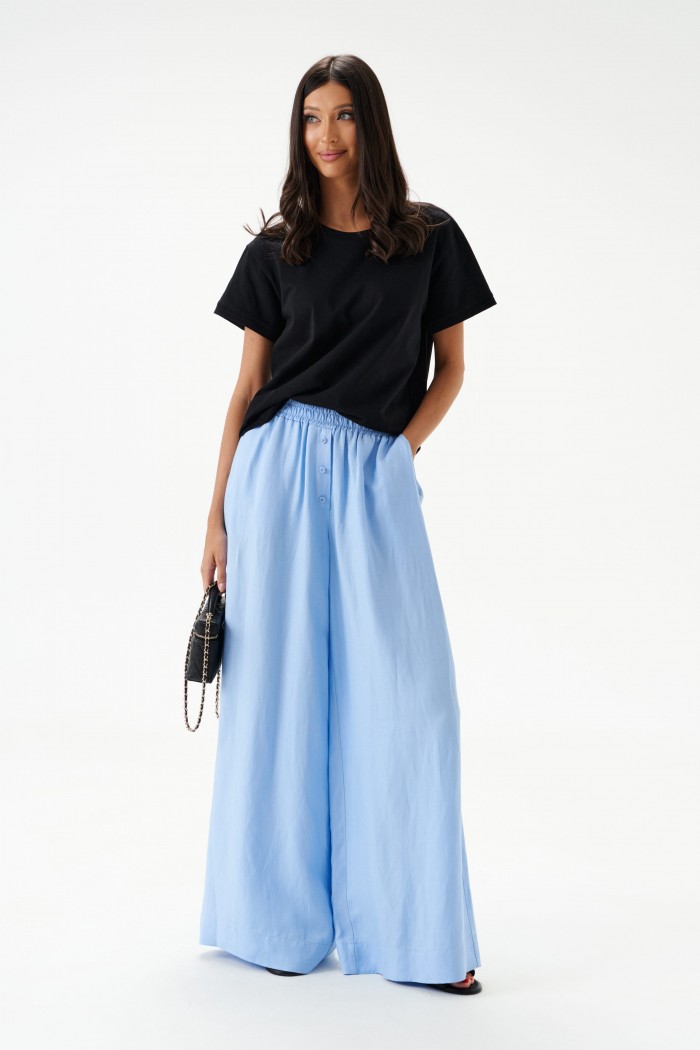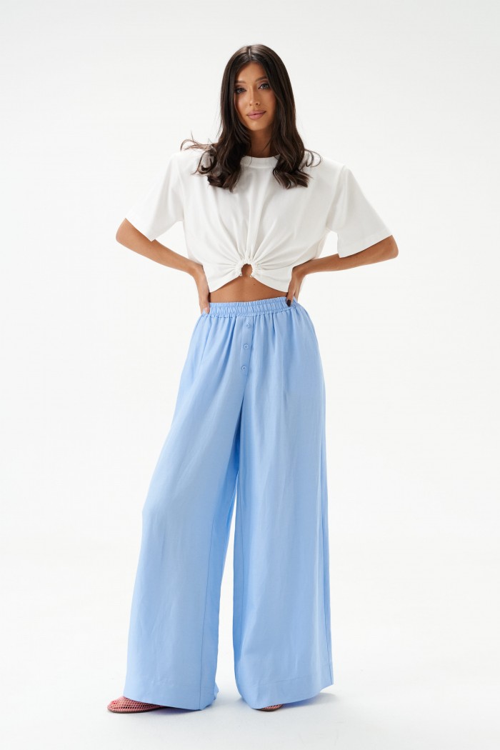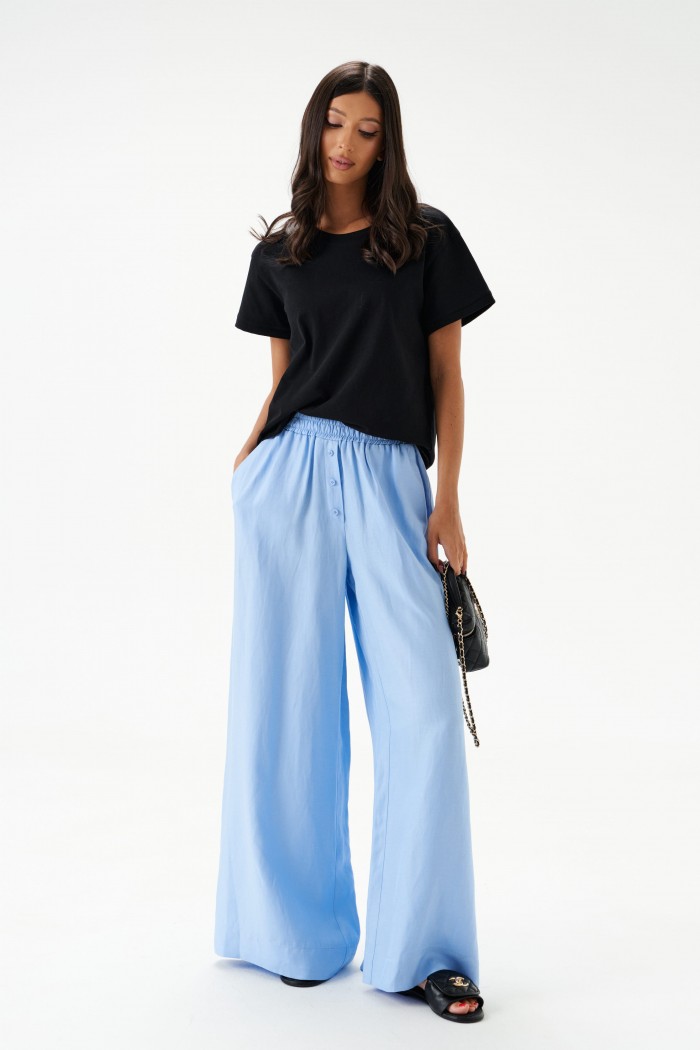 Брюки свободного кроя. Выполнены из вискозно-льняной ткани голубого цвета. Пояс на резинке. В боковых швах карманы с отрезным бочком. По переду имитация застёжки. Длина по боковому шву 106 см. Брюки дополнит рубашка А2184