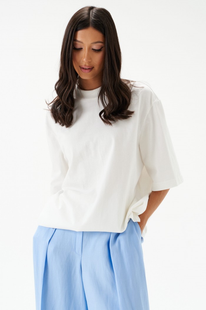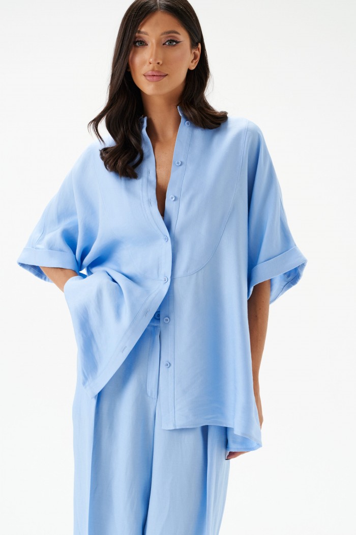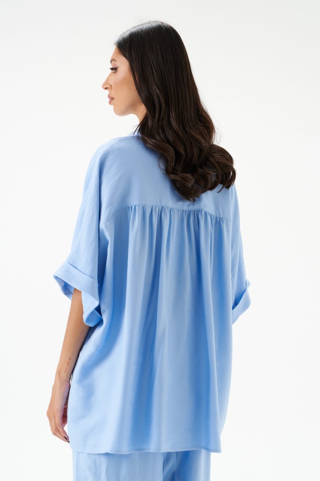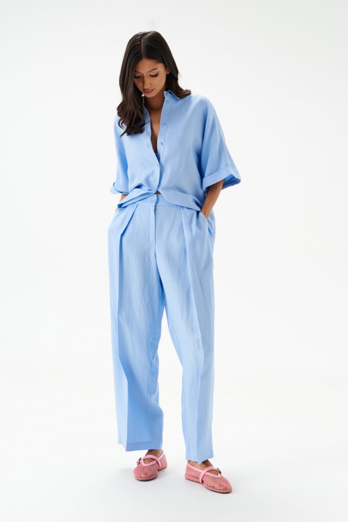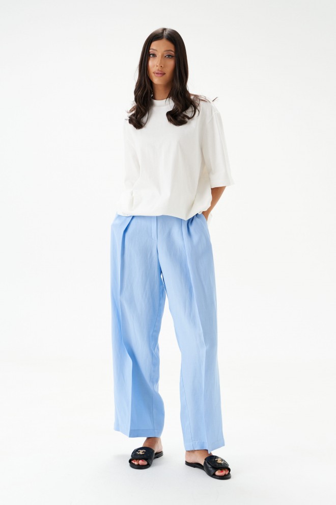 Брюки женские, длинные, прямые, выполнены из текстильного полотна голубого цвета.
