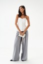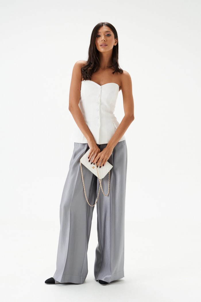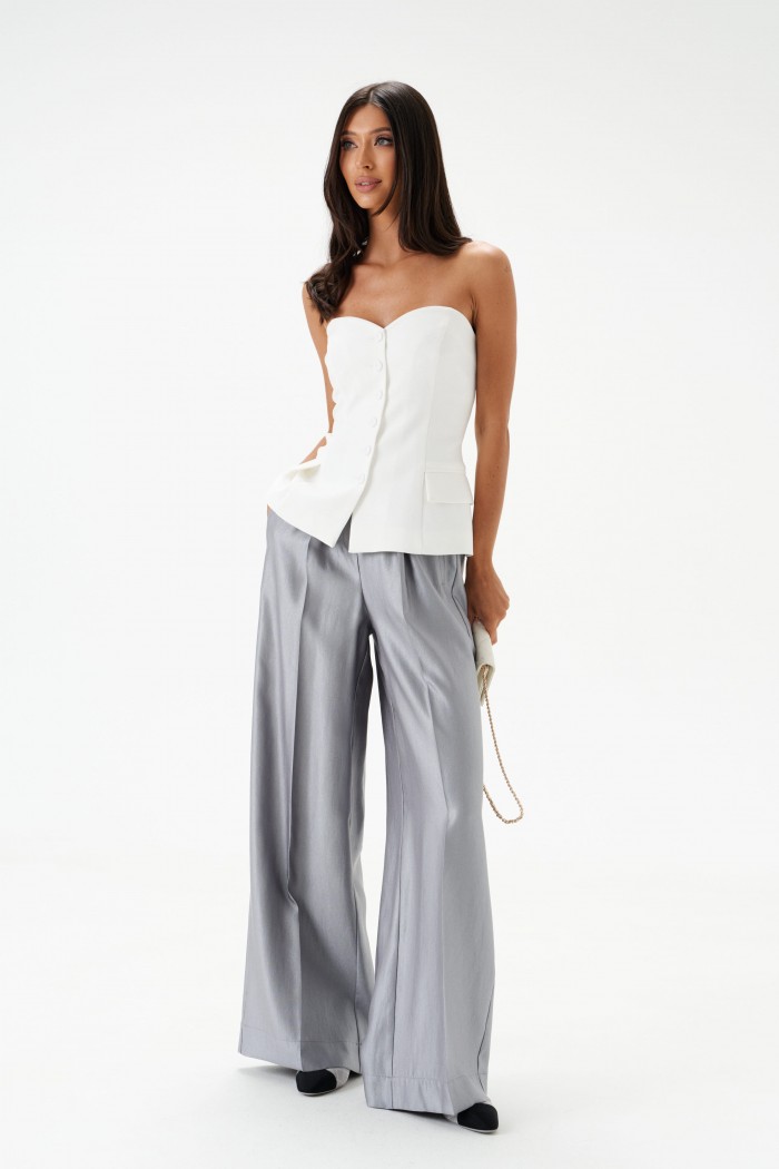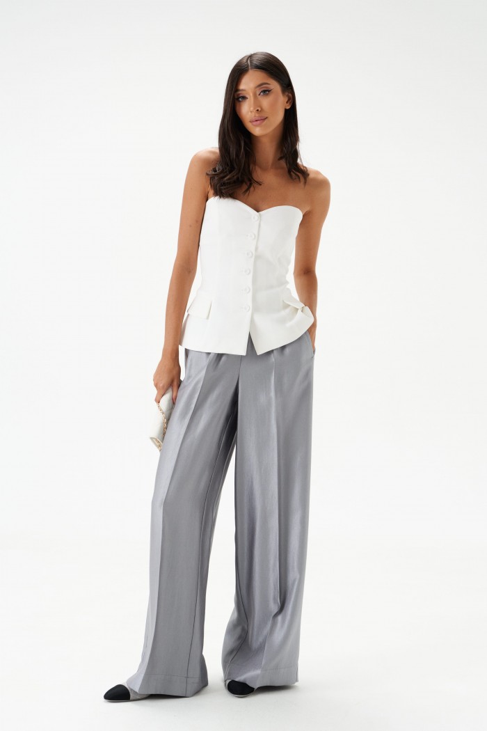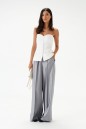 Брюки прямого свободного кроя. Выполнены из текстильной ткани с мягким блеском. Характеристики: пояс на резинке, в боковых швах карманы, стрелки по переду и сзади изделия. Длина по боковому шву 108см.