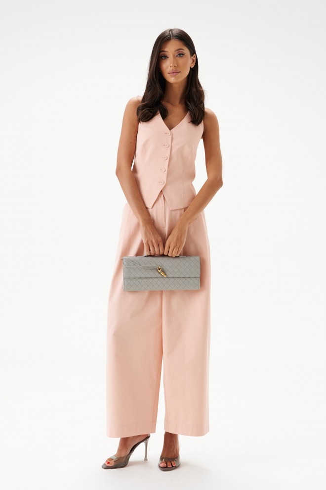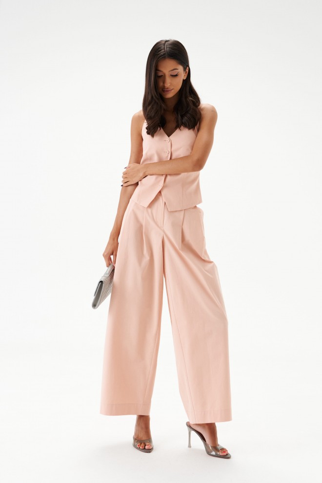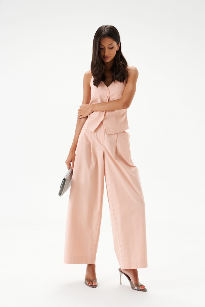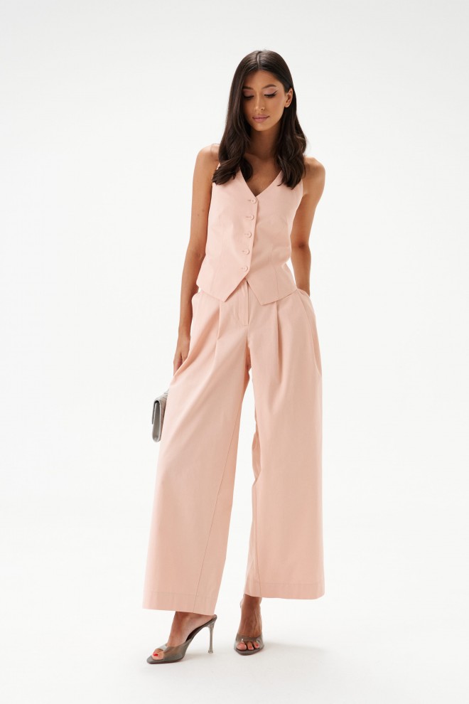 Брюки свободного кроя. Выполнены из хлопкового полотна нежно-розового цвета. Пояс по переду стабильный, пояс по спинке на резинке. По переду от пояса складки. В боковых швах карманы с отрезным бочком. По заднему полотну накладные клапаны (имитация карманов). Застёжка центральная – молния, пуговица. Длина по боковому шву 102 см. Брюки дополнит жилет А5483/1