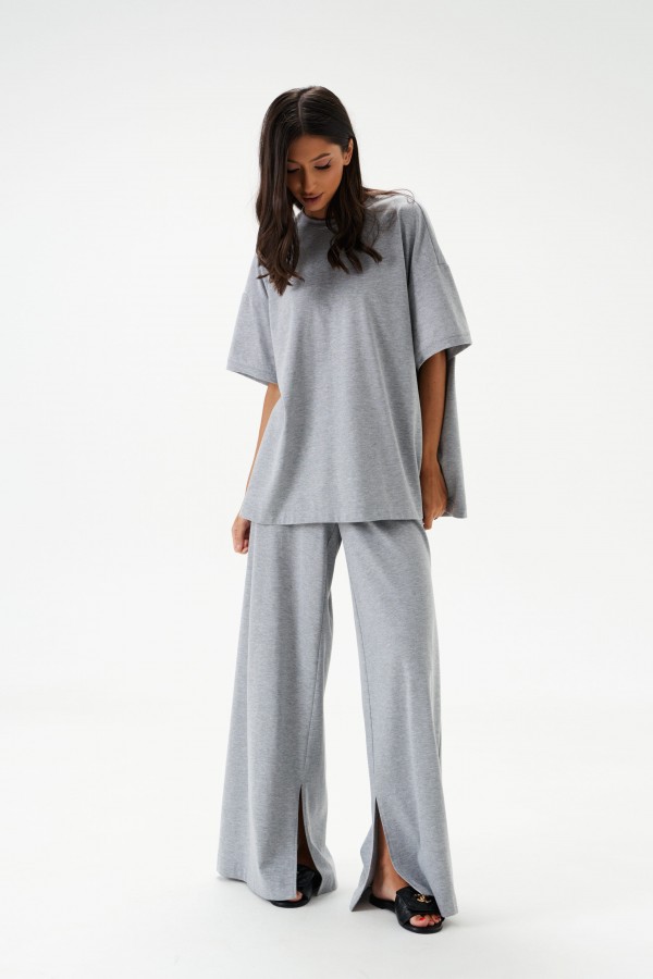 Брюки прямого кроя выполнены из трикотажного полотна серого цвета.