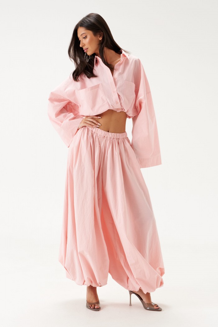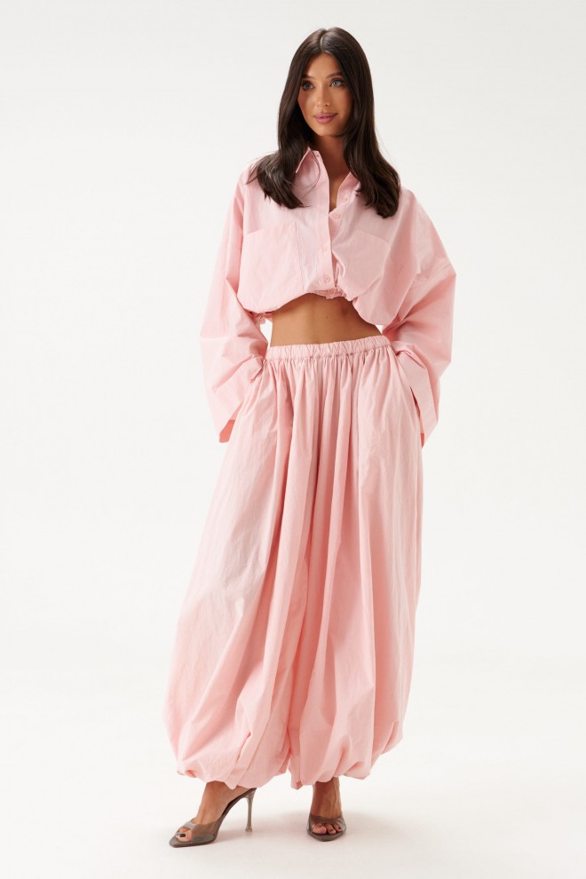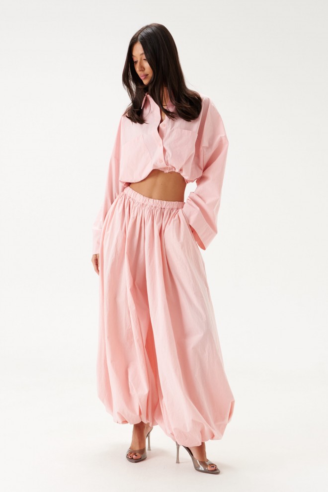 Брюки-джоггеры. Выполнены из хлопкового полотна нежно-розового цвета. Характеристики: прямой крой, пояс на резинке, в боковых швах карманы, штанина внизу на резинке с фиксатором. Длина 110 см.