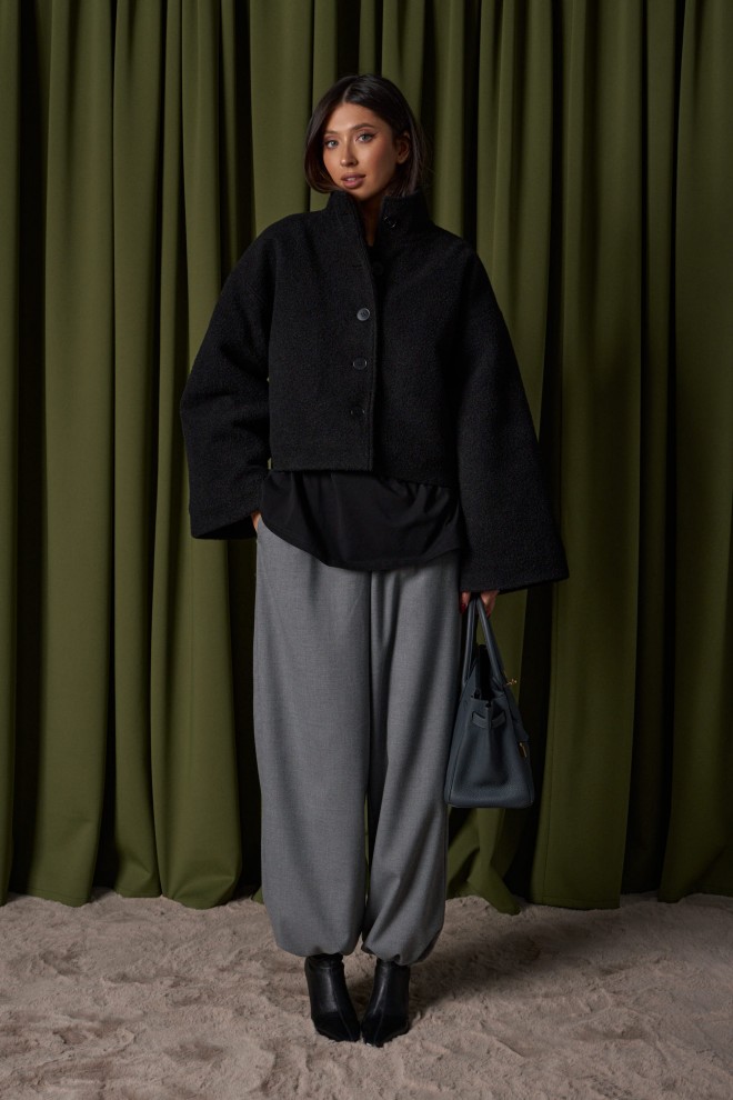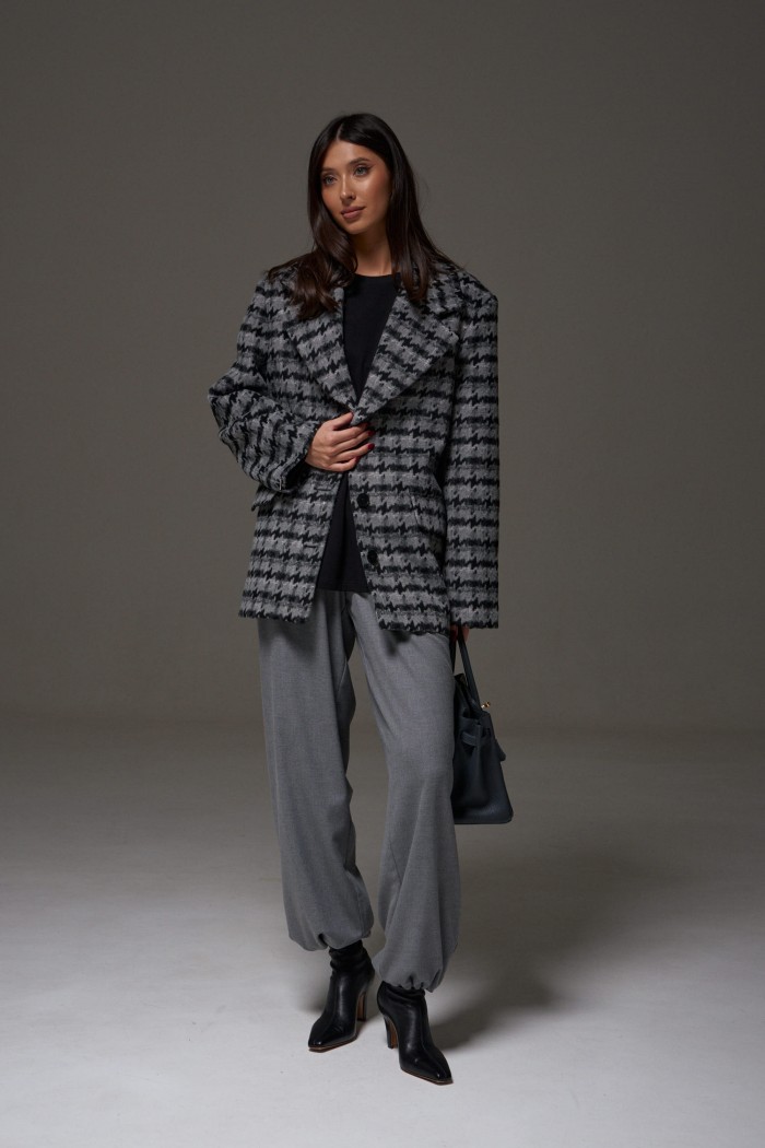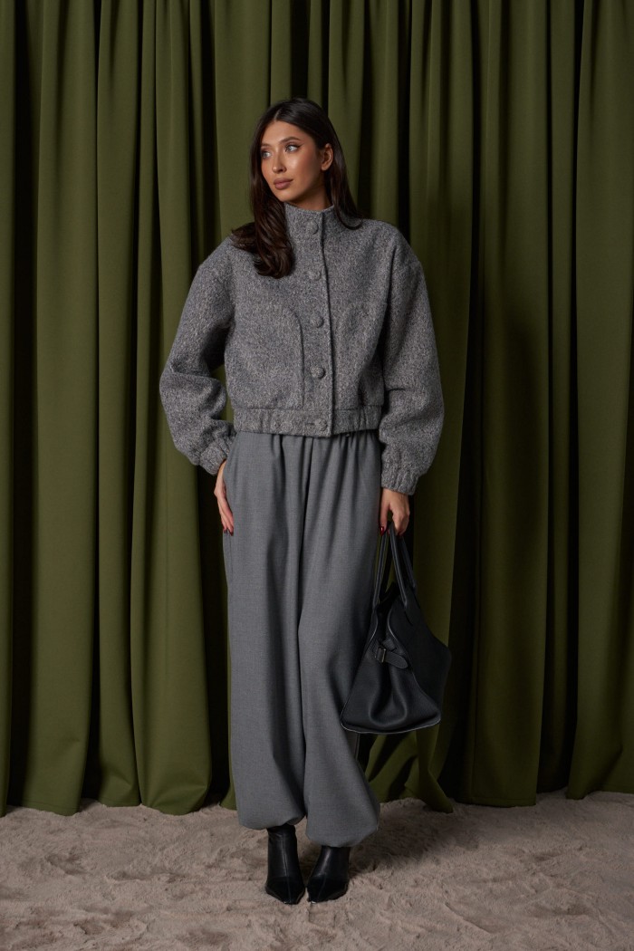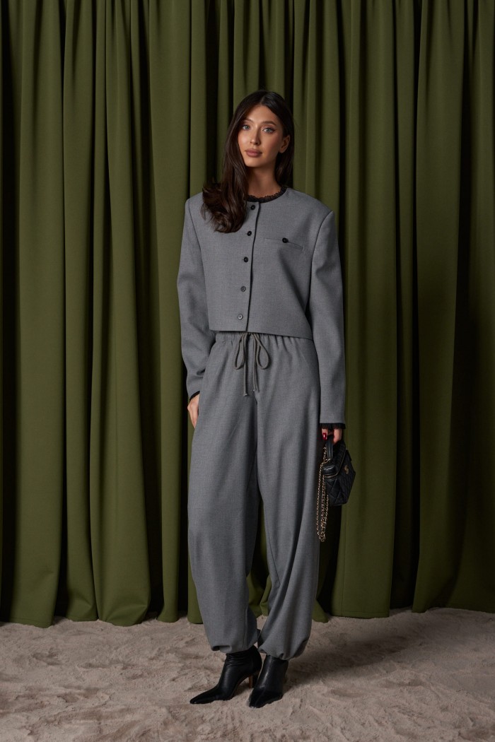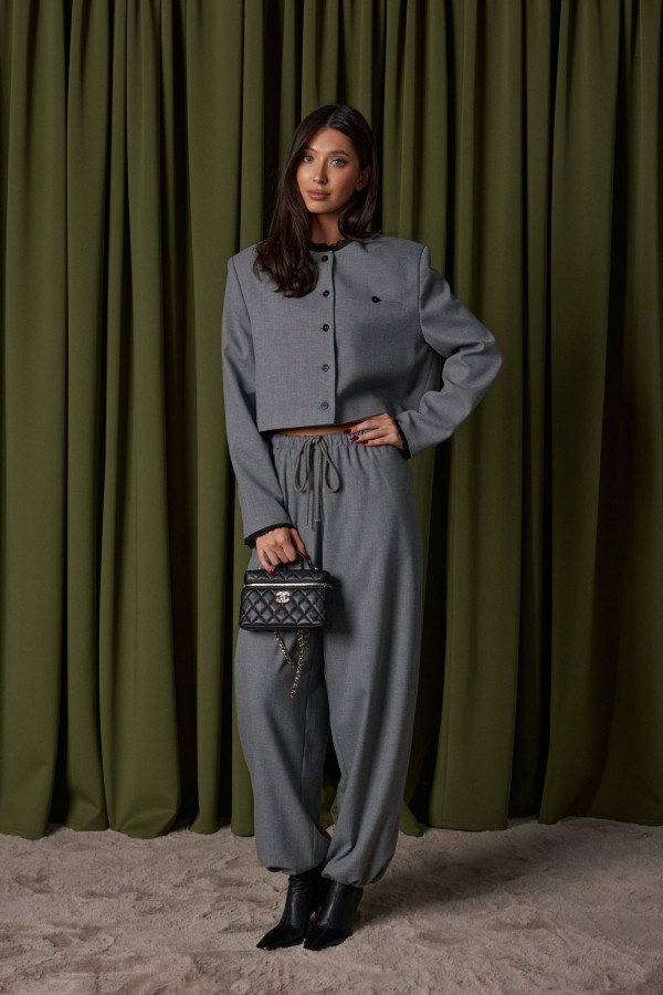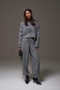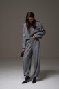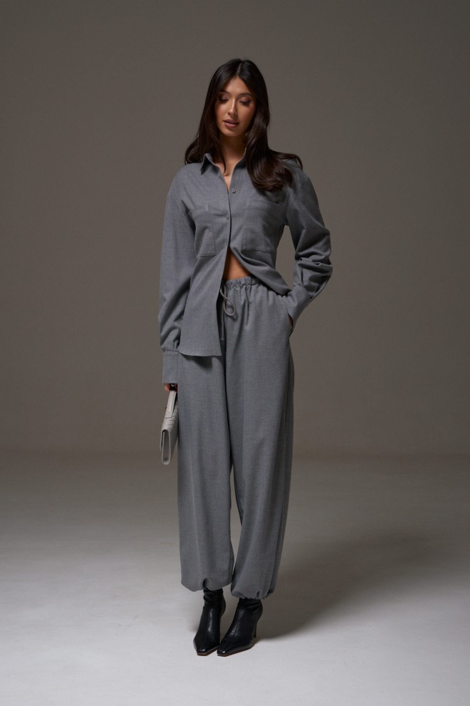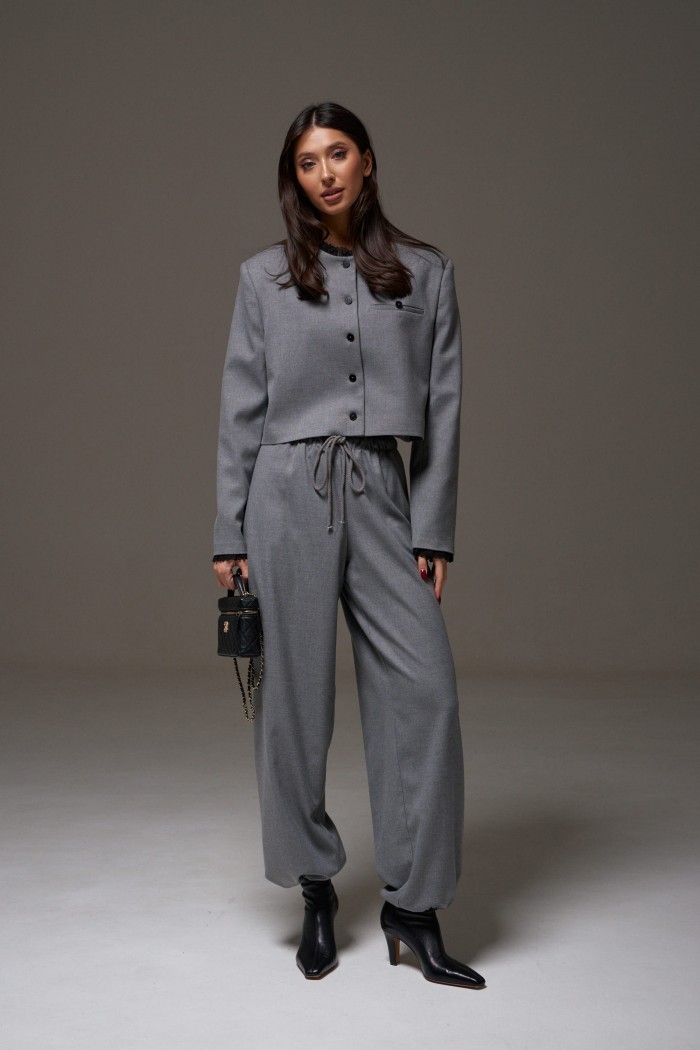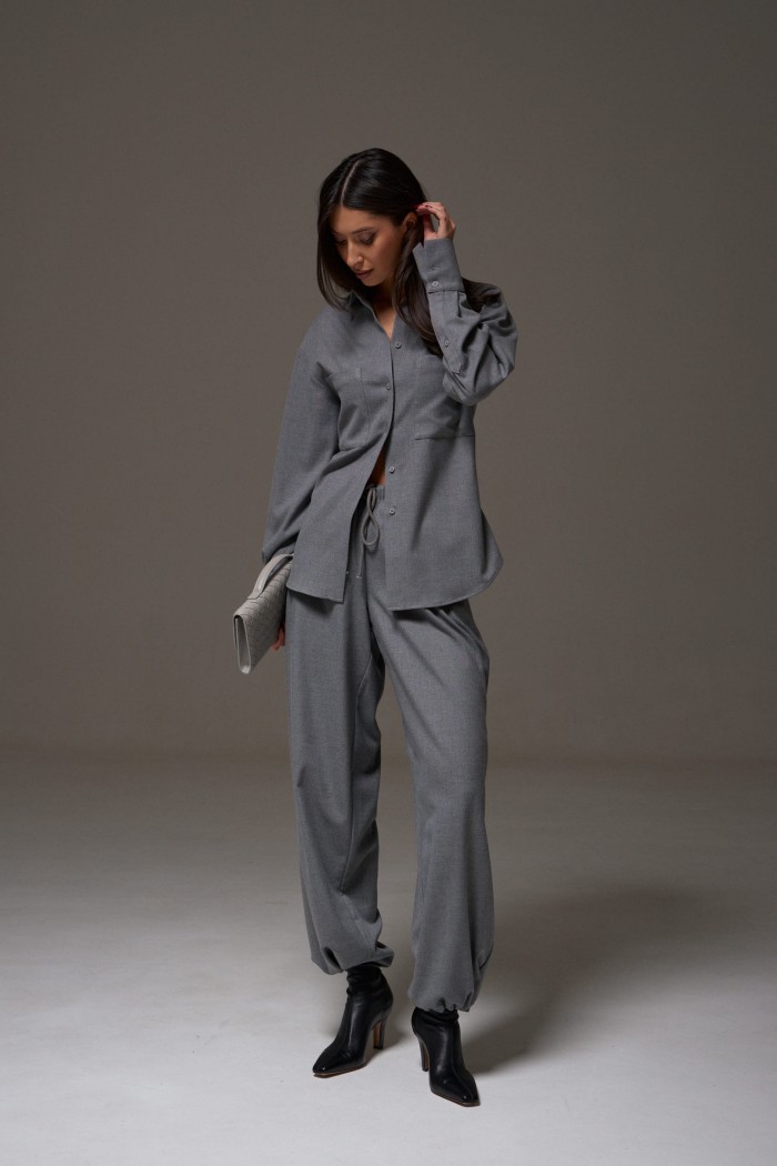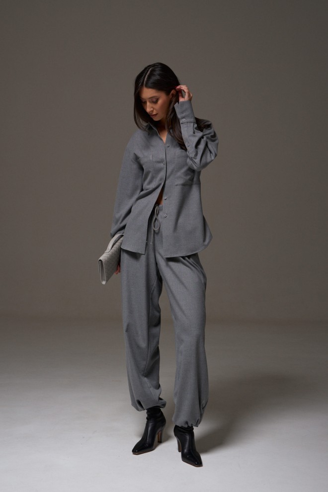 Брюки-джоггеры. Выполнены из мягкого текстильного полотна цвета серый меланж. Характеристики: прямой крой, пояс на резинке, в боковых швах карманы, штанина внизу на резинке с фиксатором. Длина 107 см.