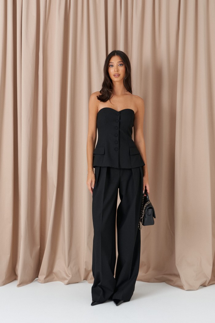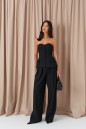 Брюки прямого свободного кроя, выполнены из костюмной ткани черного цвета. Характеристики: прямой крой, пояс стабильный, по поясу нашиты шлевки, декоративная сборка по передней части, заутюженные стрелки по передней и задней части брюк. Длина изделия по боковому шву 112 см.