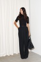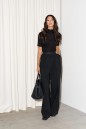 Брюки прямого кроя выполнены из ткани черного цвета. Характеристики: прямой крой, эластичная брендированная резинка, боковые карманы, на передних и задних частях брюк застрочены складки и заутюжены стрелки. Длина брюк 114 см.