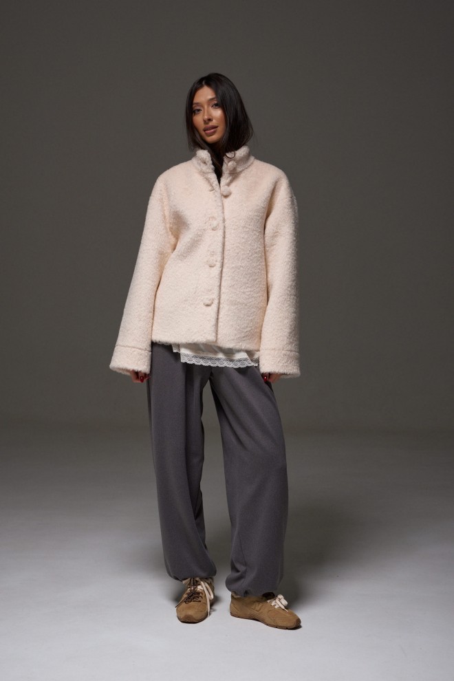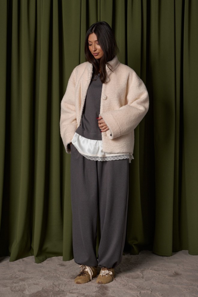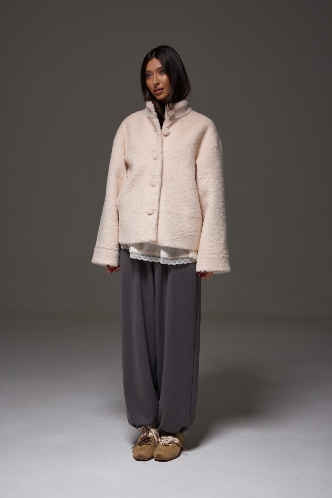 Брюки-джоггеры. Выполнены из мягкого текстильного ворсистого полотна графитового цвета. Характеристики: прямой крой, пояс на резинке, в боковых швах карманы, на задней части изделия имитация накладных карманов, штанина внизу на резинке с фиксатором. Длина 107 см.