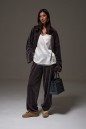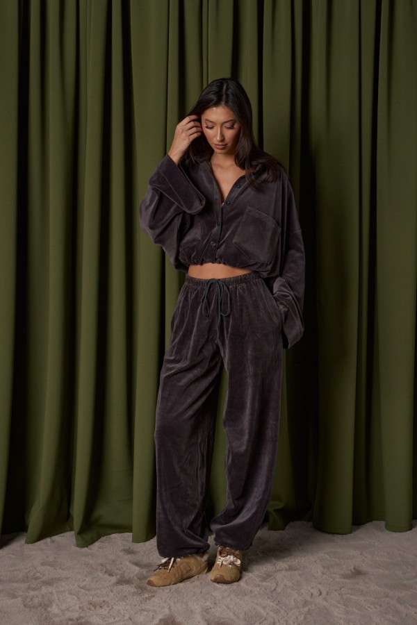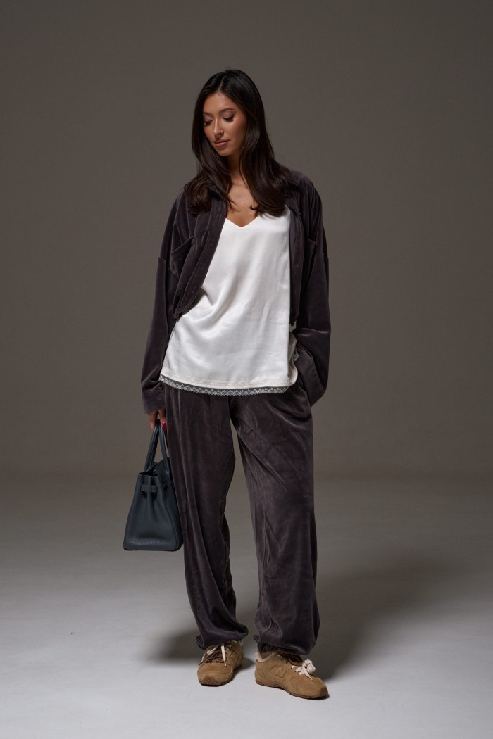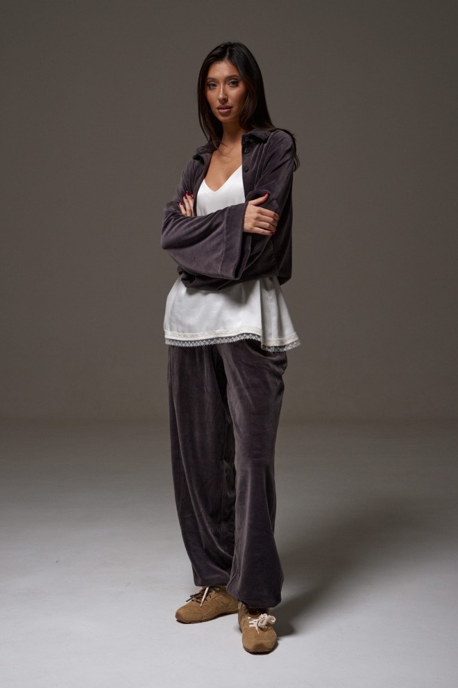 Брюки-джоггеры, выполнены из мягкого полотна велюра графитового цвета. Характеристики: прямой крой, пояс на резинке, в боковых швах карманы, на задней части изделия имитация карманов, штанина внизу на резинке с фиксатором. Длина 107 см.