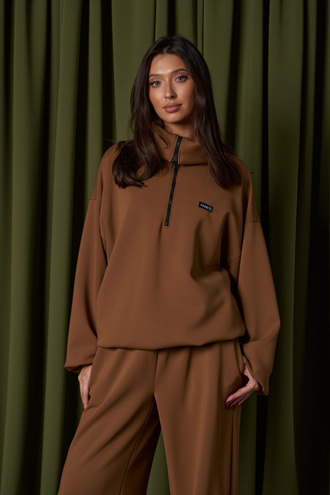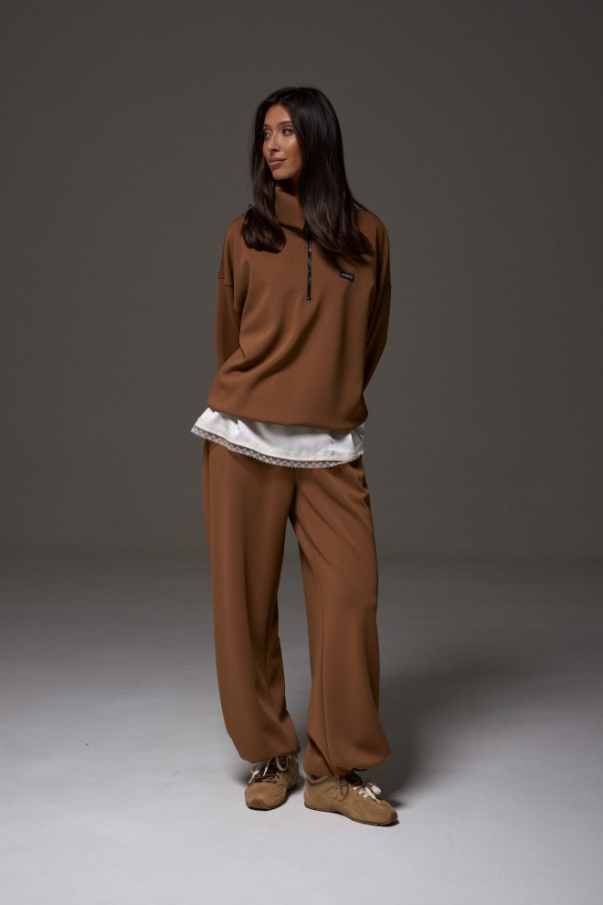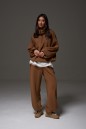 Брюки выполнены из трикотажного полотна кофейного цвета. Характеристики: прямой крой, пояс на резинке с кулиской, в боковых швах карманы, накладные карманы на задней части брюк, штанина внизу на резинке с фиксатором. Длина по боковому шву 104 см.