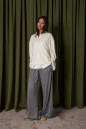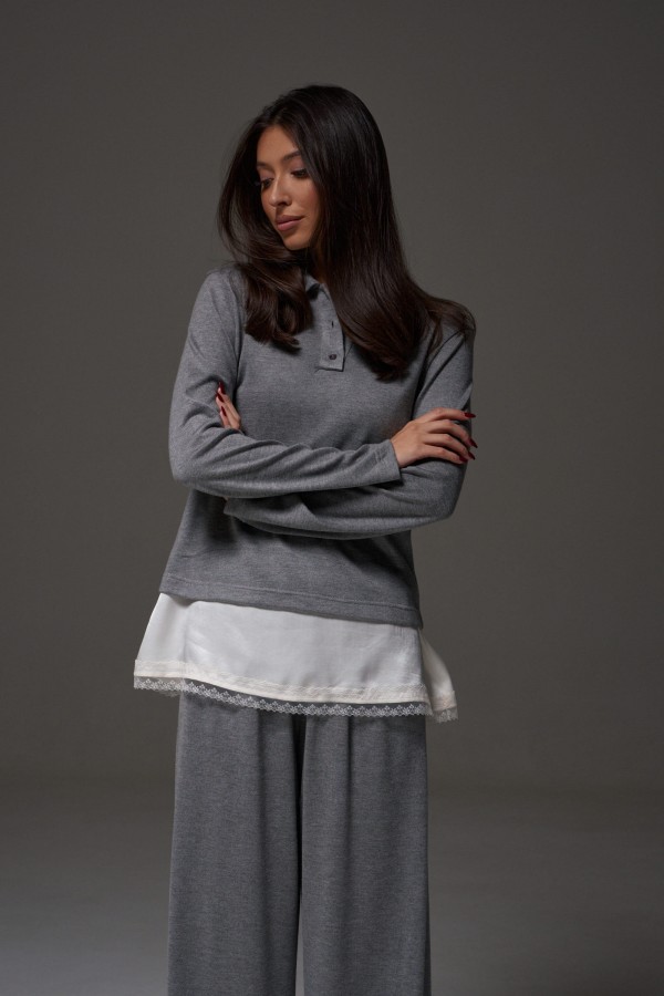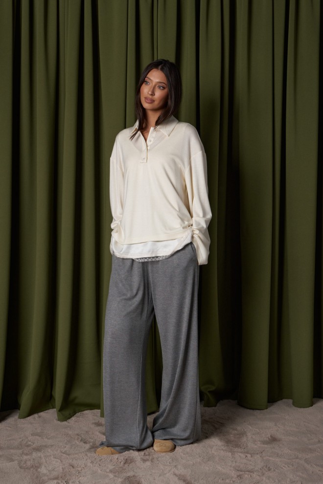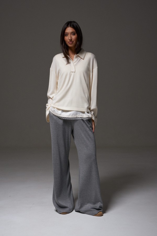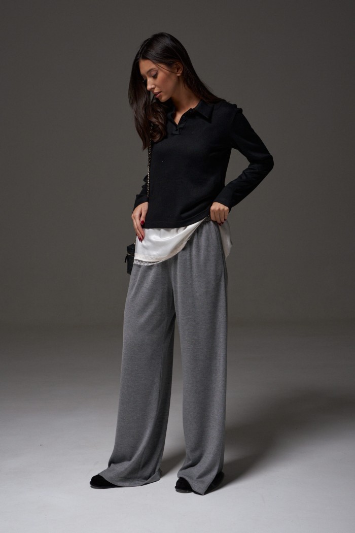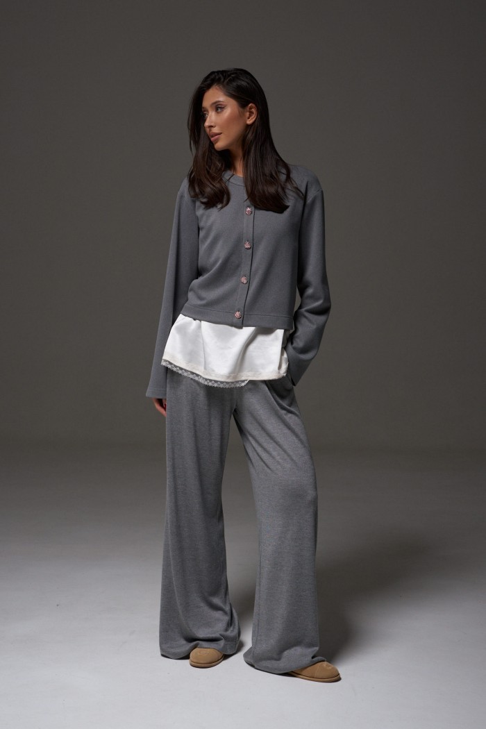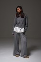 Брюки прямого, свободного кроя выполнены из трикотажного полотна серого цвета. Характеристики: прямой крой, пояс на резинке, в боковых швах карманы. Длина брюк 107 см.