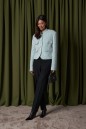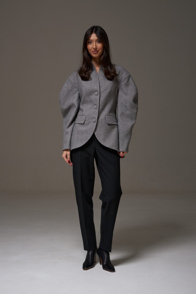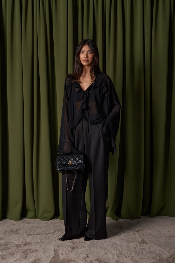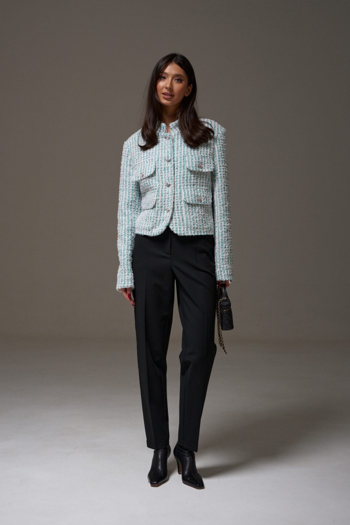 Брюки выполнены из текстильного полотна черного цвета. Характеристики: зауженные к низу, пояс стабильный, по поясу нашиты шлевки, застежка на две пуговицы и молнию, в боковых швах карманы. Длина 105 см.