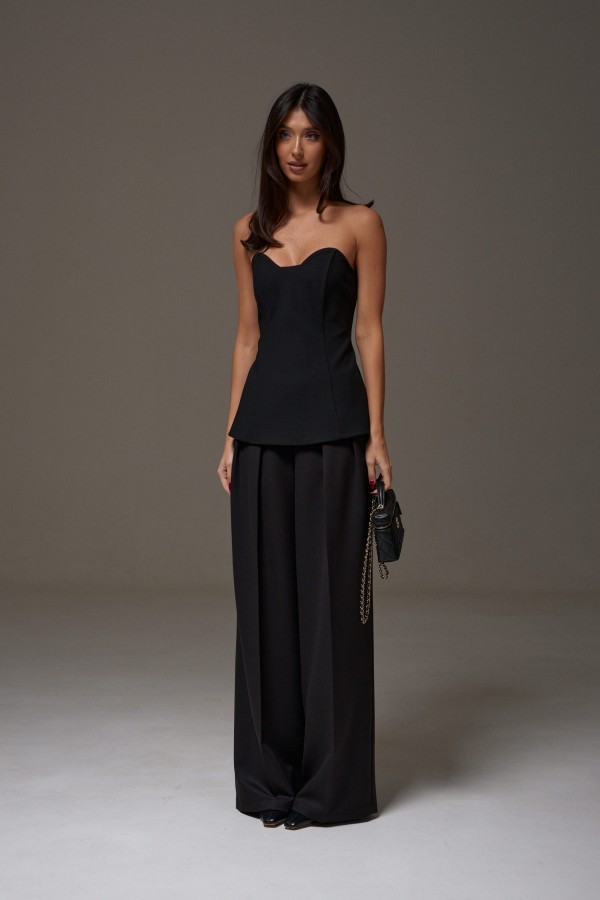 Брюки прямого кроя выполнены из ткани черного цвета.