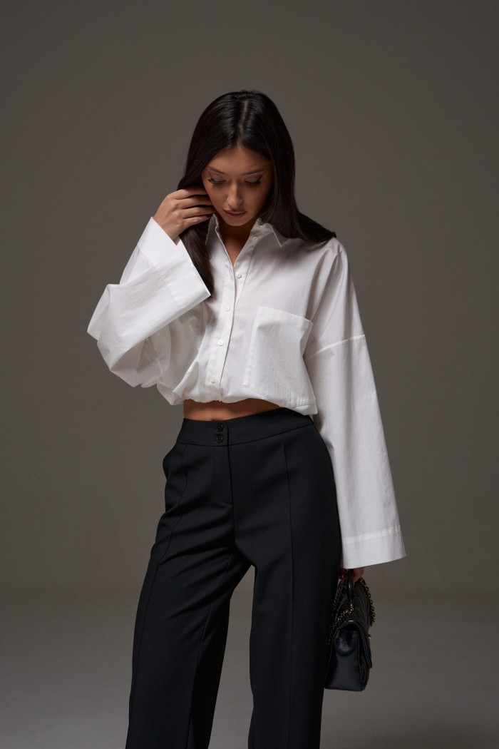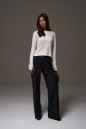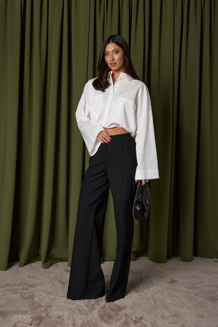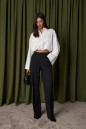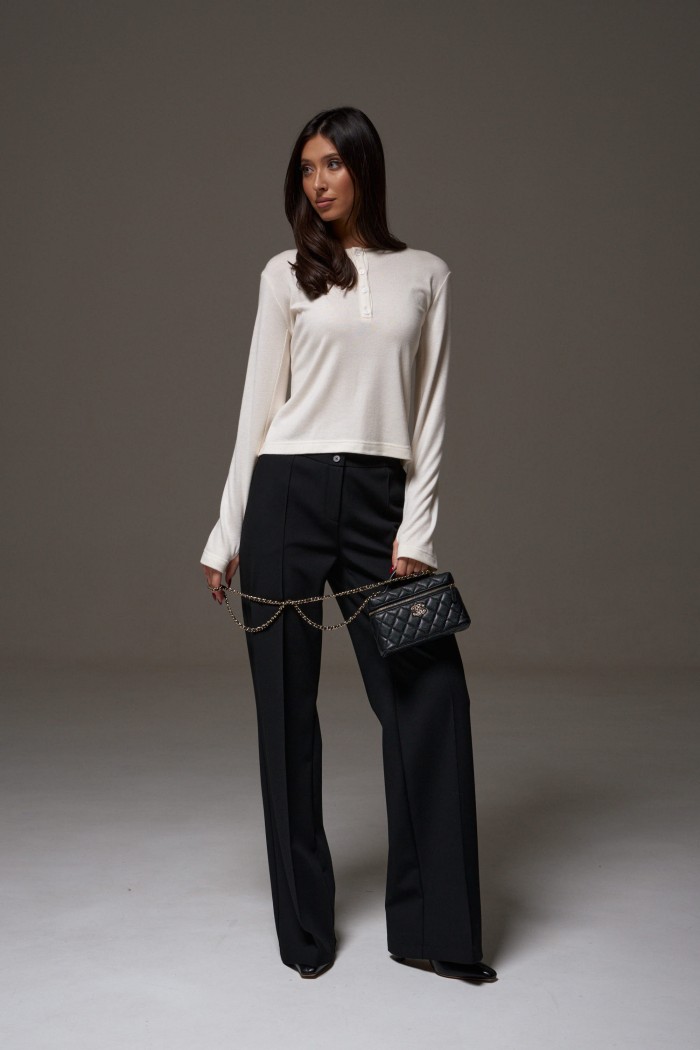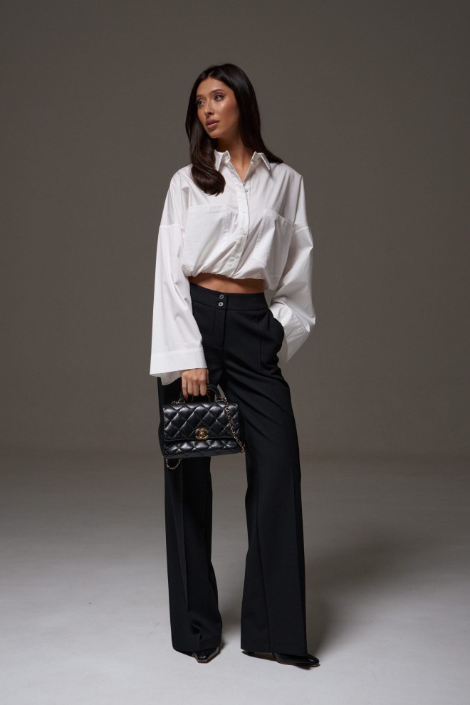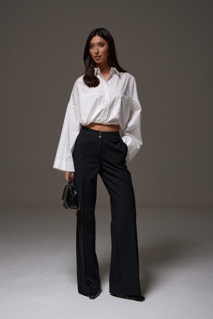 Брюки прямого кроя, выполнены из черной костюмной ткани. Характеристика: прямой крой, пояс стабильный, застежка на петли - пуговицы, молния. В боковых швах карманы. По передней и задней части изделия простроченные стрелки. Длина по боковому шву 111см, длина брюк по внутреннему шву 84см.