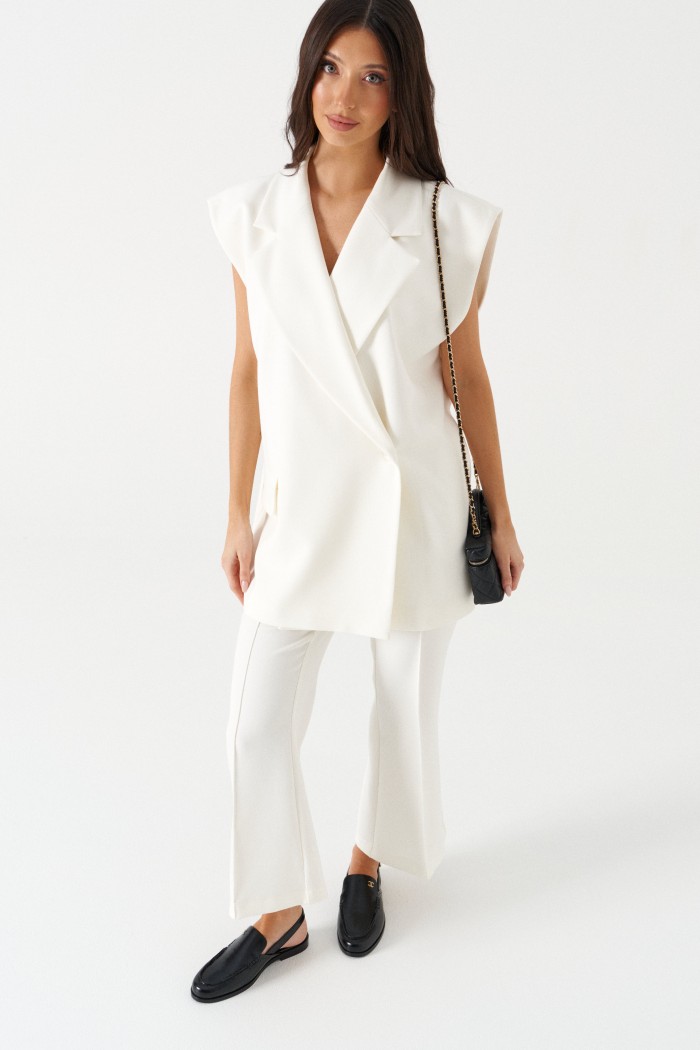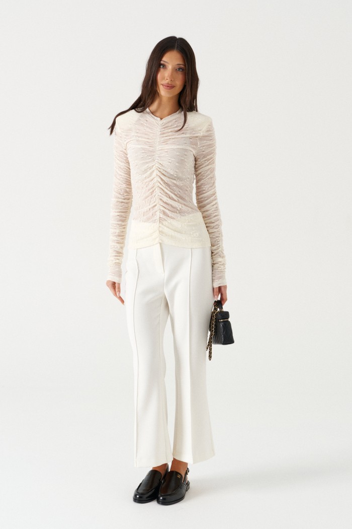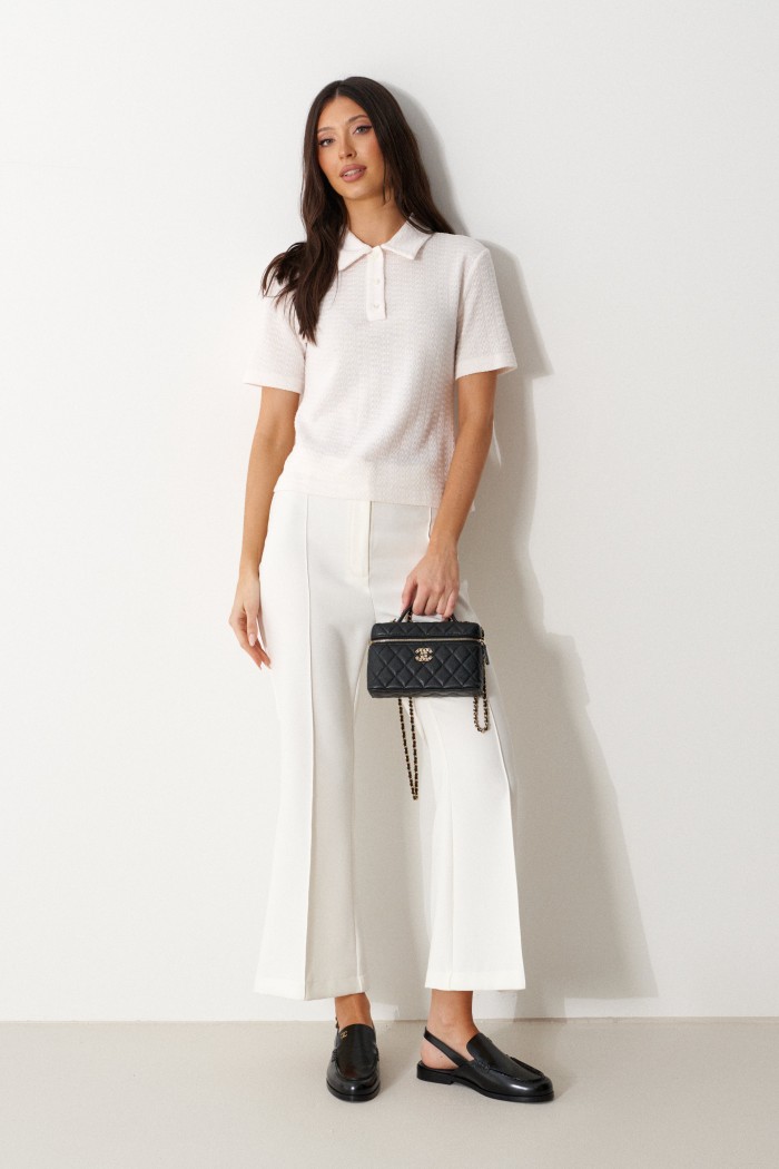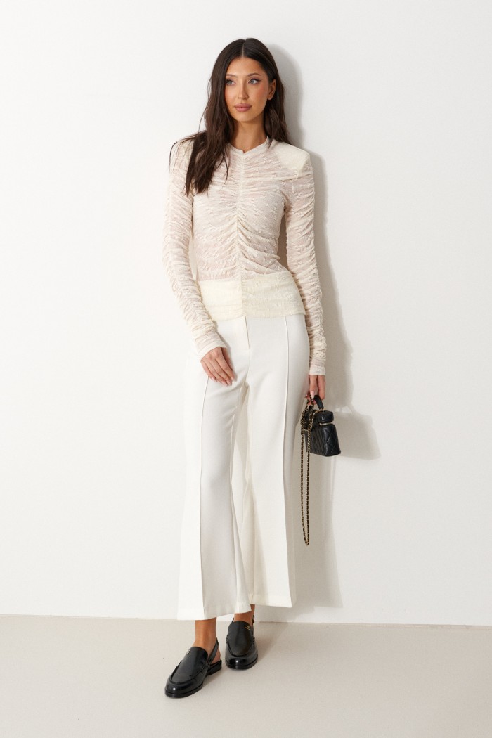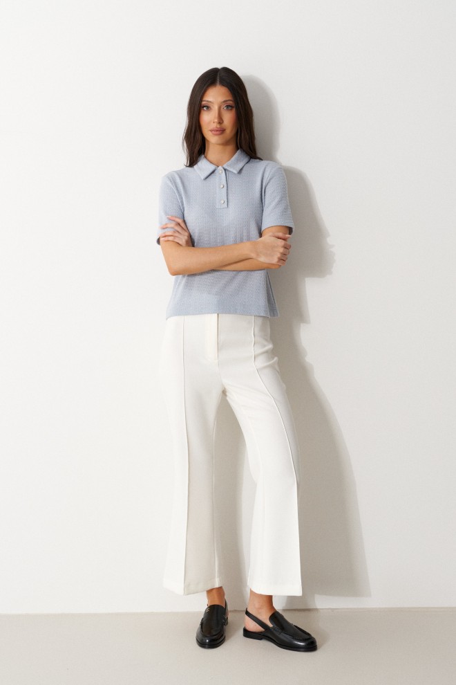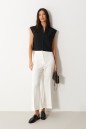Брюки облегающего силуэта, расклешенные к низу, укороченные, выполнены из костюмной ткани молочного цвета. Характеристика: На задних частях брюк обработаны талиевые вытачки и заутюжены и отстрочены стрелки. По передней части заутюжены и отстрочены срелки. Застежка молния брючного типа с гульфиком и откоском. Пояс стабильный застегивающийся на петлю, пуговицу. Длина брюк по боковому шву 94 см.
