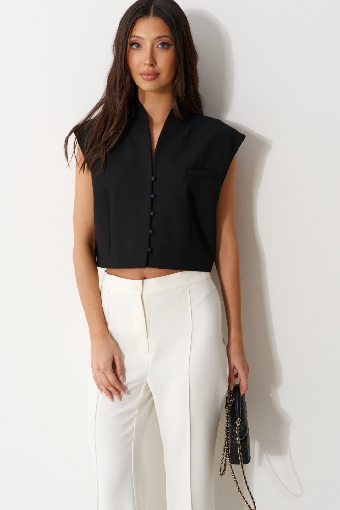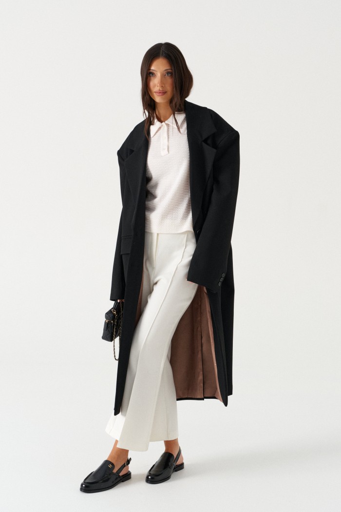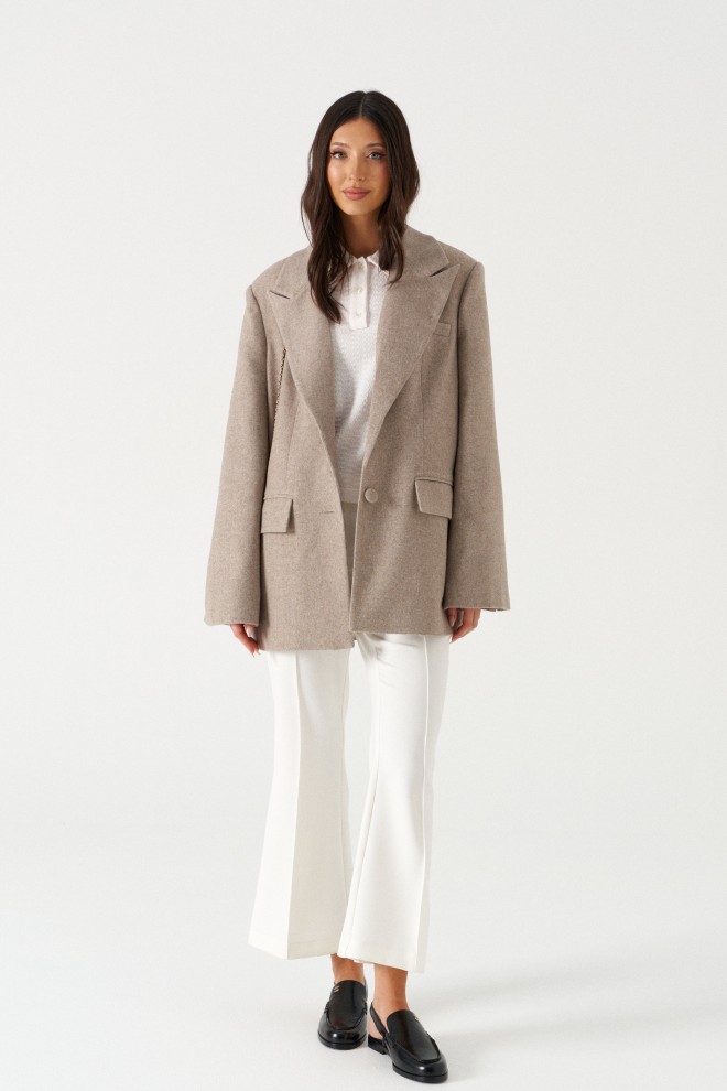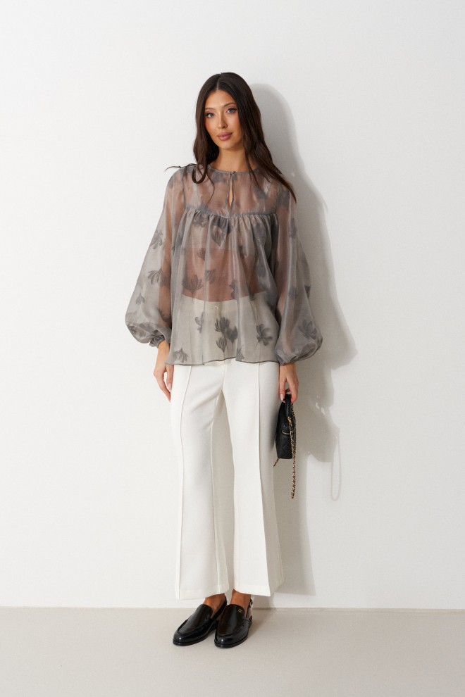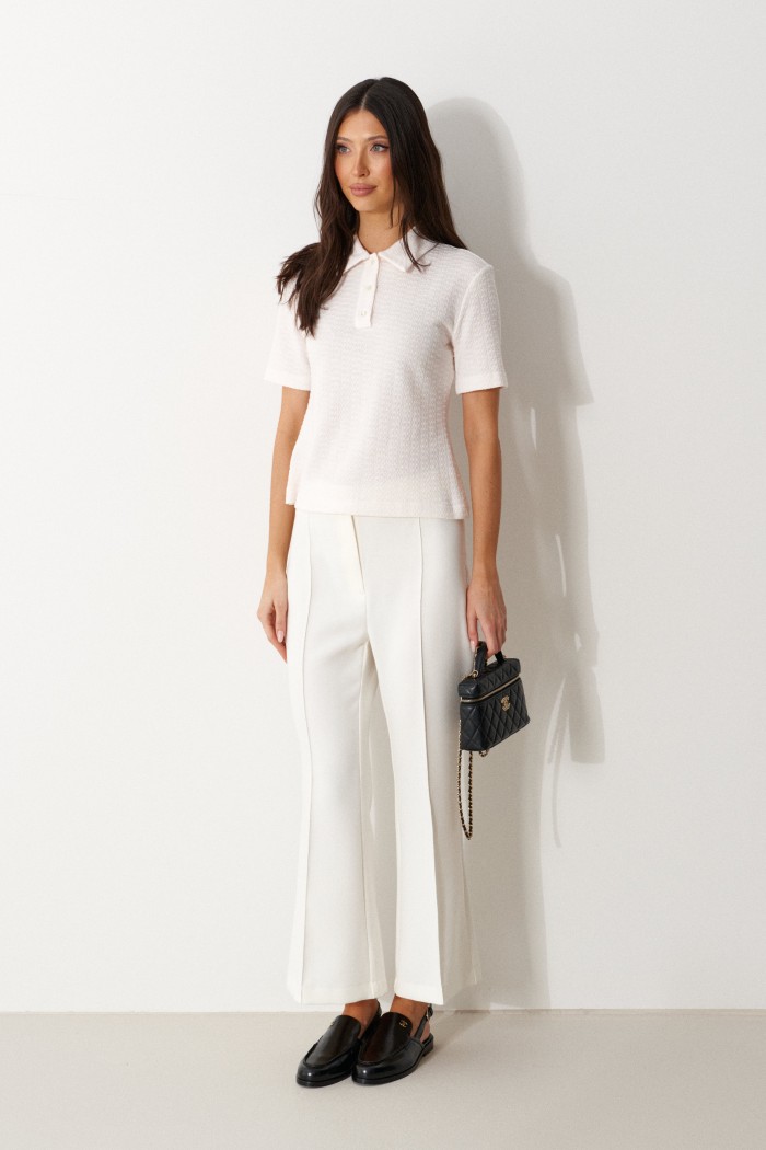 Брюки облегающего силуэта, расклешенные к низу, укороченные, выполнены из костюмной ткани молочного цвета. Характеристика: На задних частях брюк обработаны талиевые вытачки и заутюжены и отстрочены стрелки. По передней части заутюжены и отстрочены срелки. Застежка молния брючного типа с гульфиком и откоском. Пояс стабильный застегивающийся на петлю, пуговицу. Длина брюк по боковому шву 94 см.